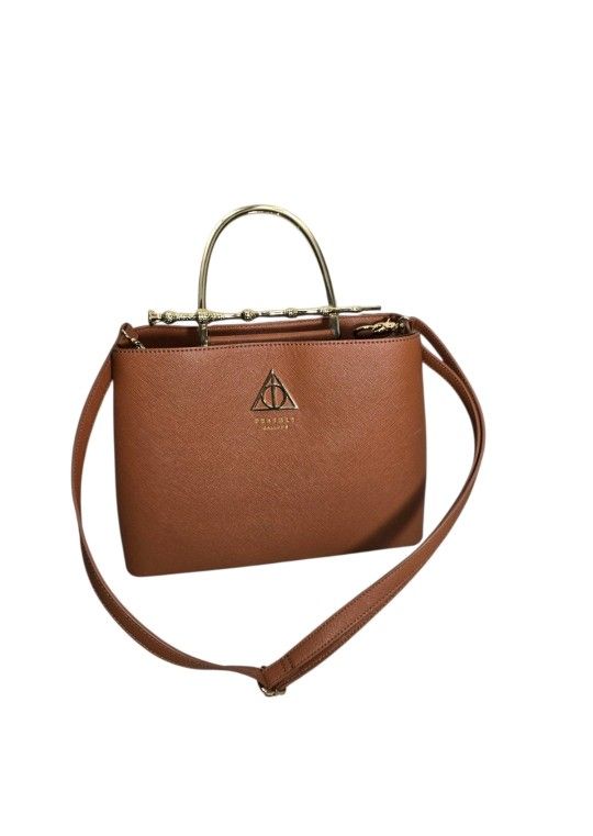 Loungefly Harry Potter Elder Wand Handbag Deathly Hallows Satchel Cognac Condition: New without tags Fabric type: Faux Leather, Polyester Closure type: Magnetic Button Lining: Polyester Approx. 12 1/2" X 9" X 5" Polyurethane; Polyester Lining Cast a fashion spell with this cognac handbag by Loungefly! Inspired by the magic of Harry Potter, this faux leather bag features gold tone hardware—including a golden handle shaped like the Elder Wand. The grey interior lining has an allover spell print with two separate compartments and drops and zip pockets. Additional details include a magnetic button closure, metal Deathly Hallows symbol, brand badge, debossed details, and a removable and adjustable crossbody strap. Please check the photos well before buying. I can do bundles and combine the shipping . Smoke-free home You will receive the exact item shown in the photos.