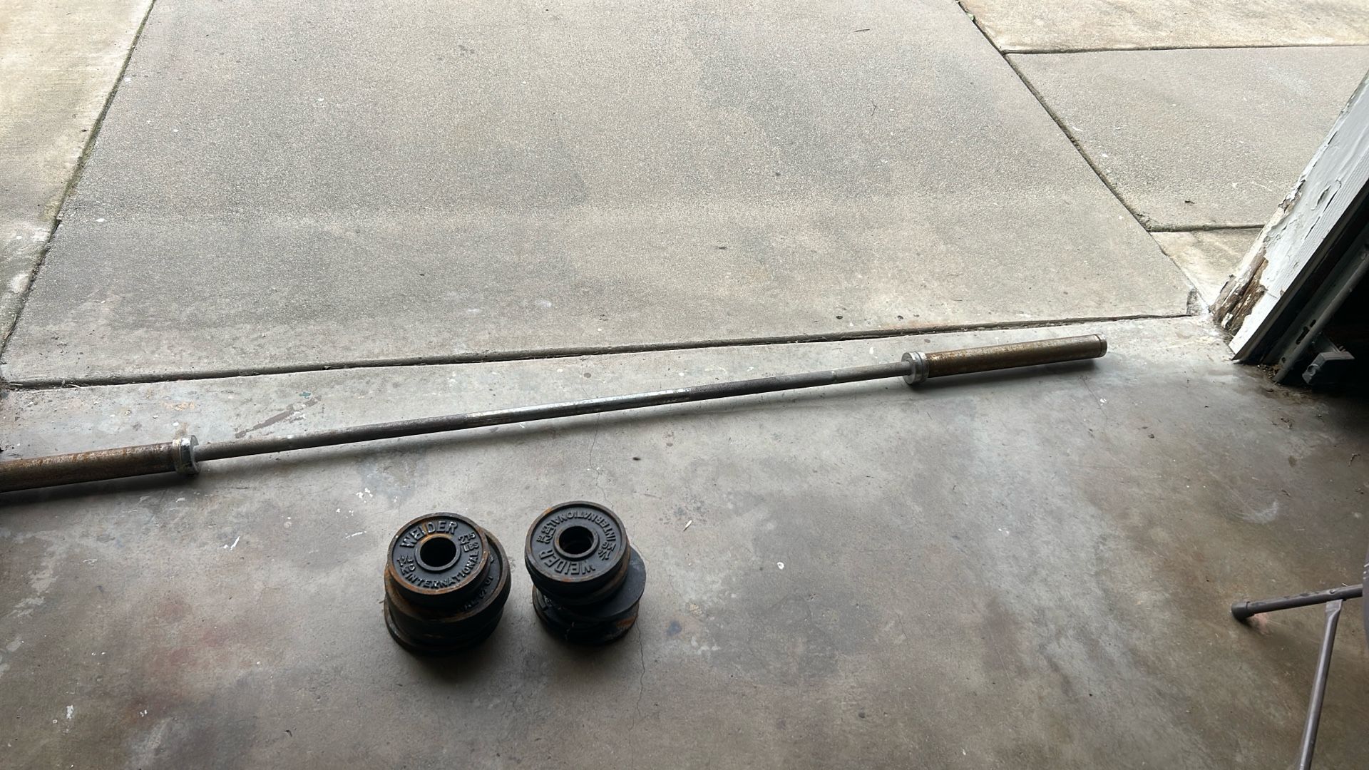 Bar with 5 pound weights and 2 pound weights. 55 pounds in weights. Good deal