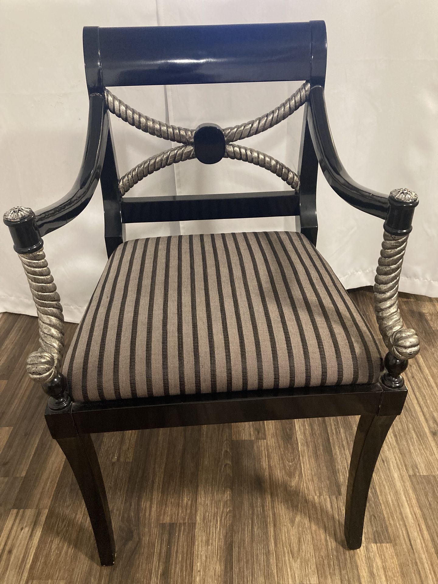 OBO!! Gimme me your best offer .. This stunning chair is a must-have for any antique or Hollywood Regency enthusiast. The ebonized parcel gilt carved rope leg chair boasts a unique style that is sure to add a touch of elegance to any room. Crafted in America and featuring original carvings, these chairs are a true antique gem. This is one chairs, measuring 22 inches in length and width and standing at 36 inches tall. The black color and intricate details make these chair a perfect addition to any collection. Don't miss out on the opportunity to own a piece of history with these beautiful Hollywood Regency chairs.