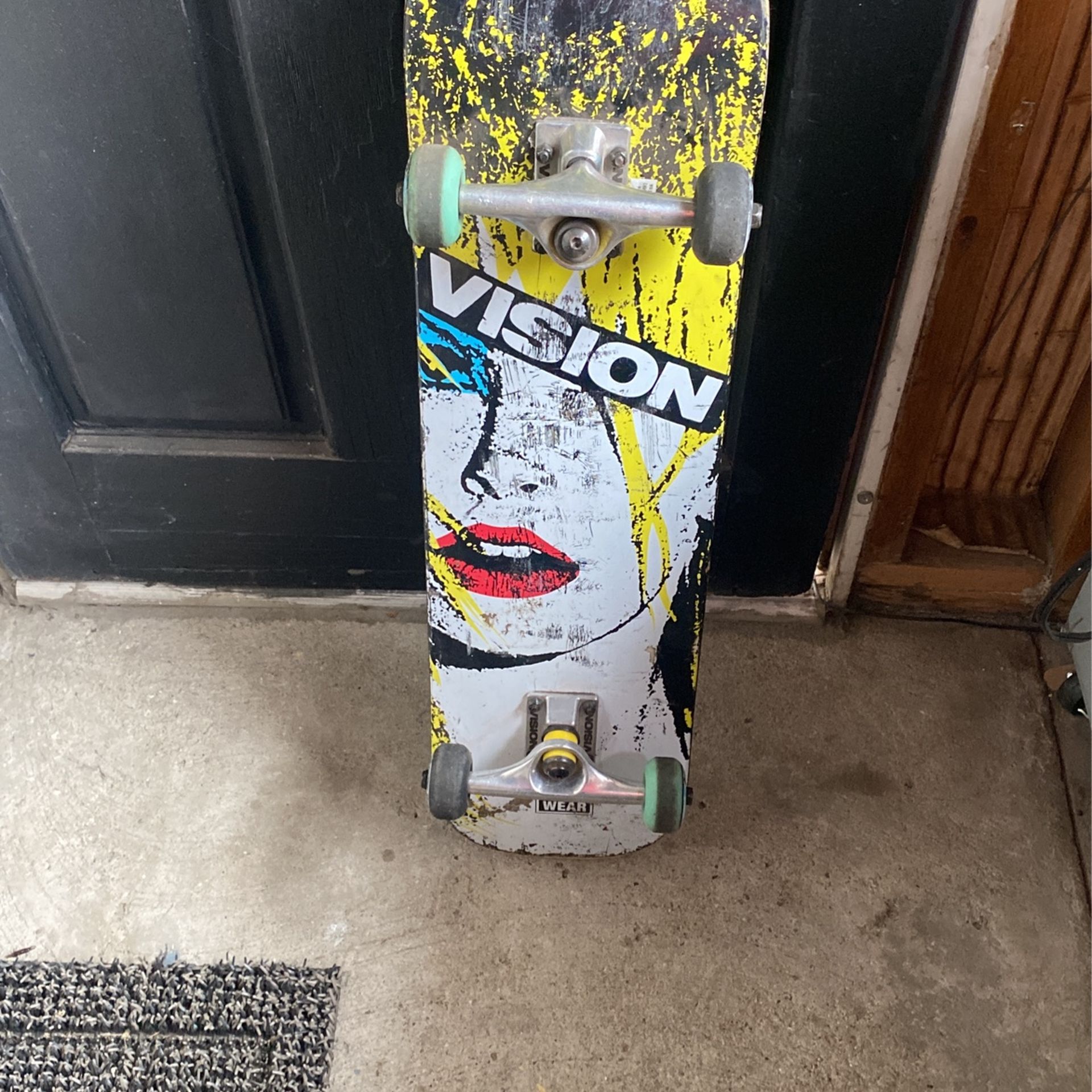 A reissue of the Aggressor from the 80s by Vision Street wear. See pictures for condition: complete deck , used . Trucks and wheels. Made by Vision Street wear also.