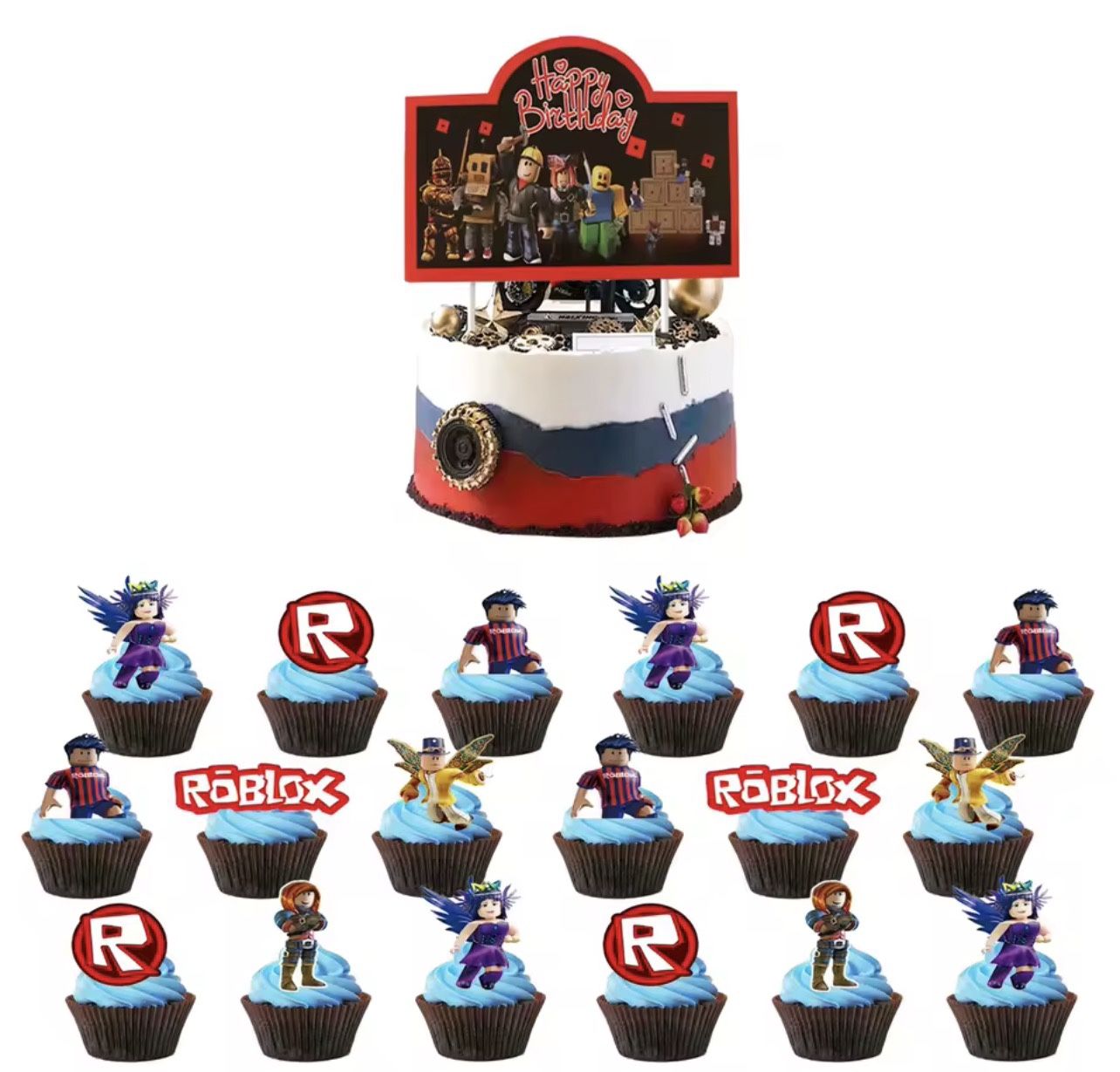 25PC Roblox Cake & Cupcake decorating kit Includes 1 Roblox Cake banner & 24 Roblox cupcake images Made out of paper and cardboard. Great color quality and images are beautiful. See photos of what you will receive.