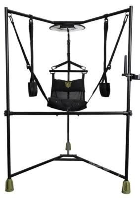 makes an x pattern on the ground and supports a sex sling that hangs from the stand.