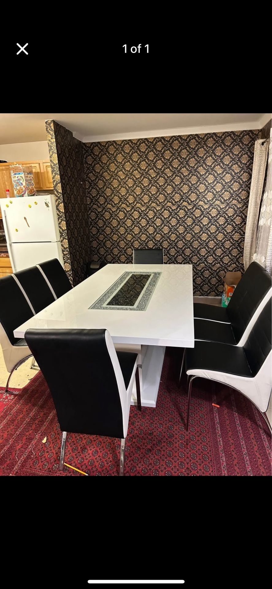 Dining table with 6 chairs. Table is 6ft “7 length and 3ft & 6 inches width . Used it for 8 months now.