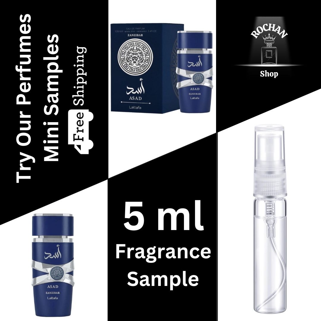 Try Our 5 ml Fragrance Sample Embrace the essence of adventure with Lattafa Asad Zanzibar, a fragrance that evokes the spirit of discovery and the allure of exotic destinations. Named after the mesmerizing island of Zanzibar, known for its pristine beaches, vibrant culture, and rich history, this fragrance captures the essence of this tropical paradise in a bottle. Top Notes: Black pepper, Lavender Middle Notes: Salty Coconut, Iris Base Notes: vanilla, and incense.