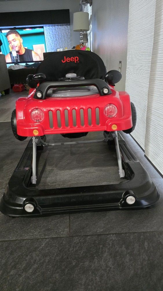 Adjustable seat height allows the walker to grow with your child | 3-in-1 design converts from baby walker mode into push-behind mode and a rolling toy car mode with toy storage Resembles the classic Wrangler with its seven-slot grille, round headlamps and flat fender flares Toy tray features steering wheel that turns left to right and makes realistic horn and engine sounds, turn signals light up, remove the toy tray to reveal a snack tray The high seat back provides comfort and maximum support | Seat pad easily wipes clean Assembled dimensions: 29.2"L x 25.1"W x 12"H