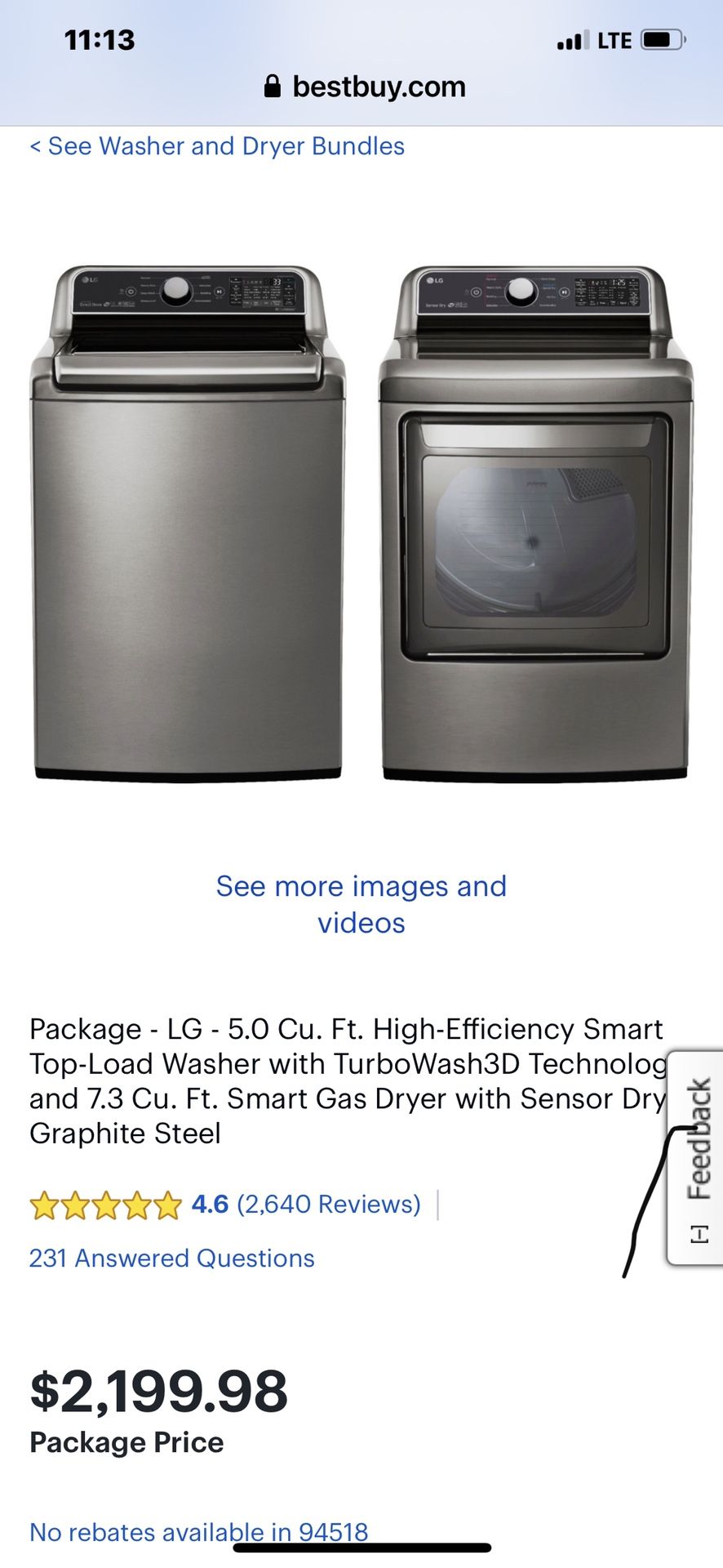 Package GL 5.0 Cu. Ft. High-Efficiency Smart Top-Load Washer with TurboWash3D Technology and 7.3 Cu. Ft. Smart Gas Dryer with Sensor Dry - Graphite Steel Washer model: WT7300CV Dryer model: DLG301Ve My price $1,499.00 Deliver available Factory warranty Call 209…/…271….0336