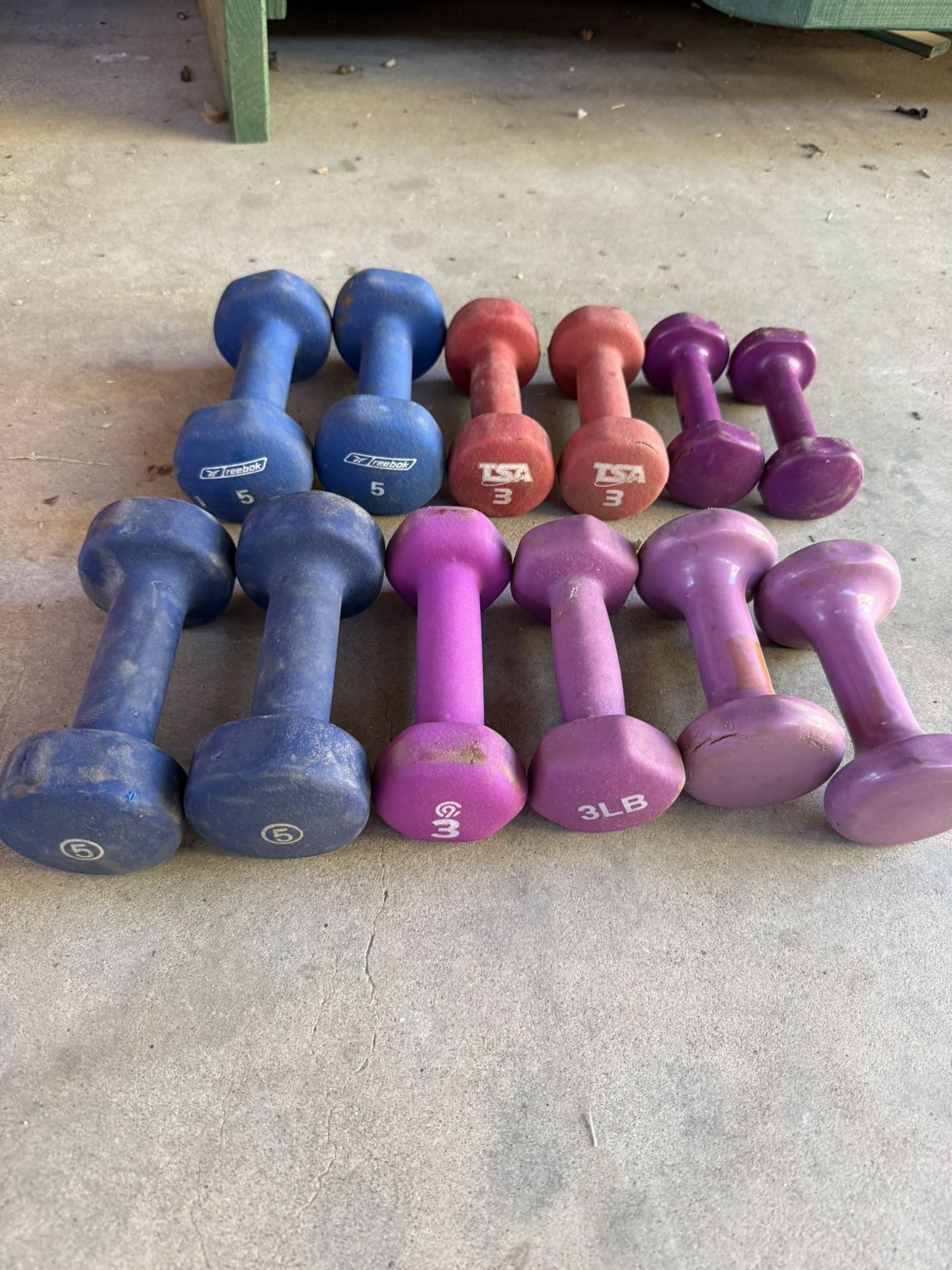 Vinyl Dumbbell Set – Multiple Pairs (2lb, 3lb, 5lb) Price: $20 per set or $30 altogether (open to offers / bundle deal preferred) Description: Assorted vinyl-coated dumbbells in good used condition. Perfect for home gym, rehab, HIIT, or light strength training. Vinyl coating helps protect floors and provides a comfortable grip. Includes: • (2) pairs of 5 lb dumbbells (blue – Reebok) • (2) pairs of 3 lb dumbbells (red/ pink– mixed brands) • (2) pair of 2 lb dumbbells (purple) Condition: Used, cosmetic wear from normal use, no cracks or damage. All weights are solid and functional.