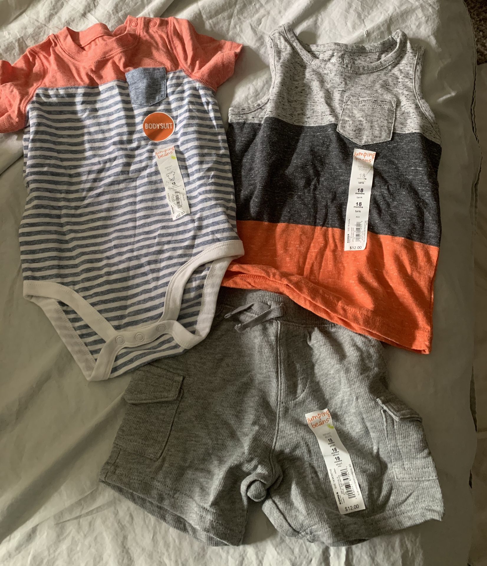 Three pieces shorts, tank top and onesies all new with tags size 18 months. My son had a growth spurt so my loss is your gain.