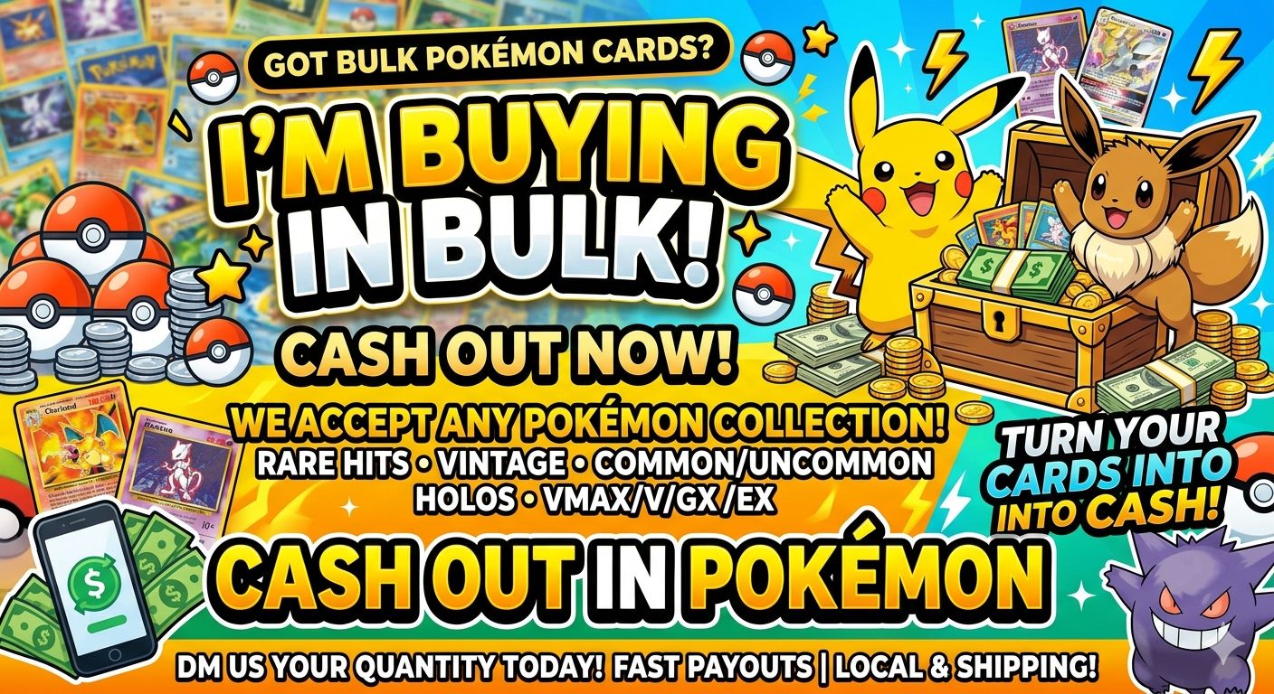 If you need cash ASAP and you have a Pokemon collection you want to get rid of message me today! 60-70% market cash for your stuff today Single low end cards 60% High end slabs 75-80%