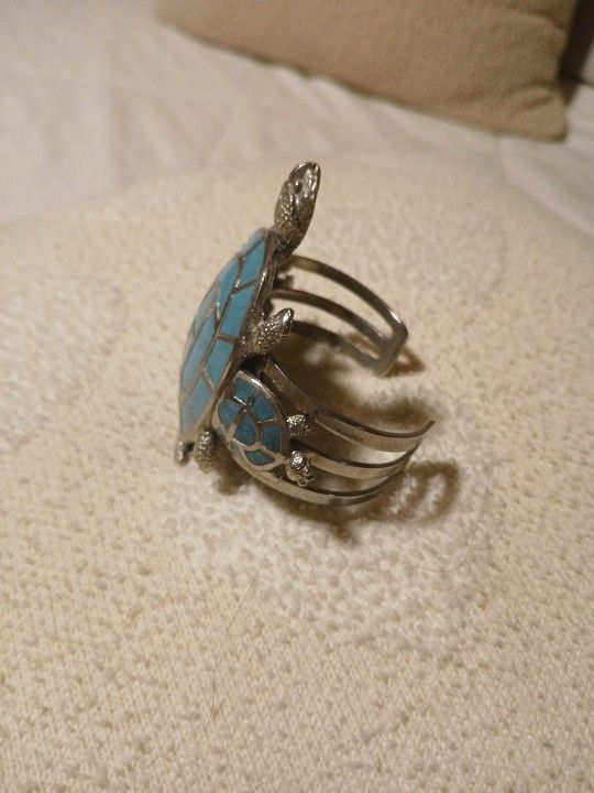 Very Unusal, Beautiful Piece..... size 3"× 3" A Wrist Band Decorative Bracelet.. from the 80's Diffently A Great Vintage Piece to Enjoy !! Made of Metal ( Have never Tarnished ) Never Having to Clean , Polish It... Having a Inlay of in the Color of Turquoise Blue.. With Design of TURTLE. So Original, I'm Sure. A Great Conversational Piece to Enjoy ! .