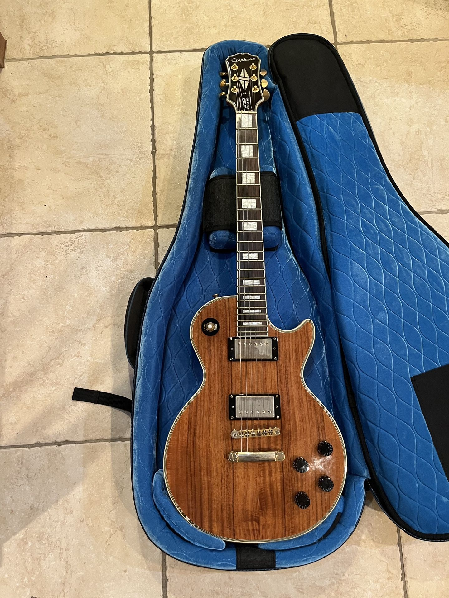 Beautiful basically new high end Epiphone Les Paul custom pro. Gorgeous koa wood finish. Sounds amazing thick humbucker sound low action and working perfectly Brand new very premium hardshell guitar case. Reunion blues these retail for $250 before tax. Really amazing case that contours around the body and fits all sorts of shapes, jazzmaster, jaguar, starcaster, hollowbodies etc. lightweight and sturdy.