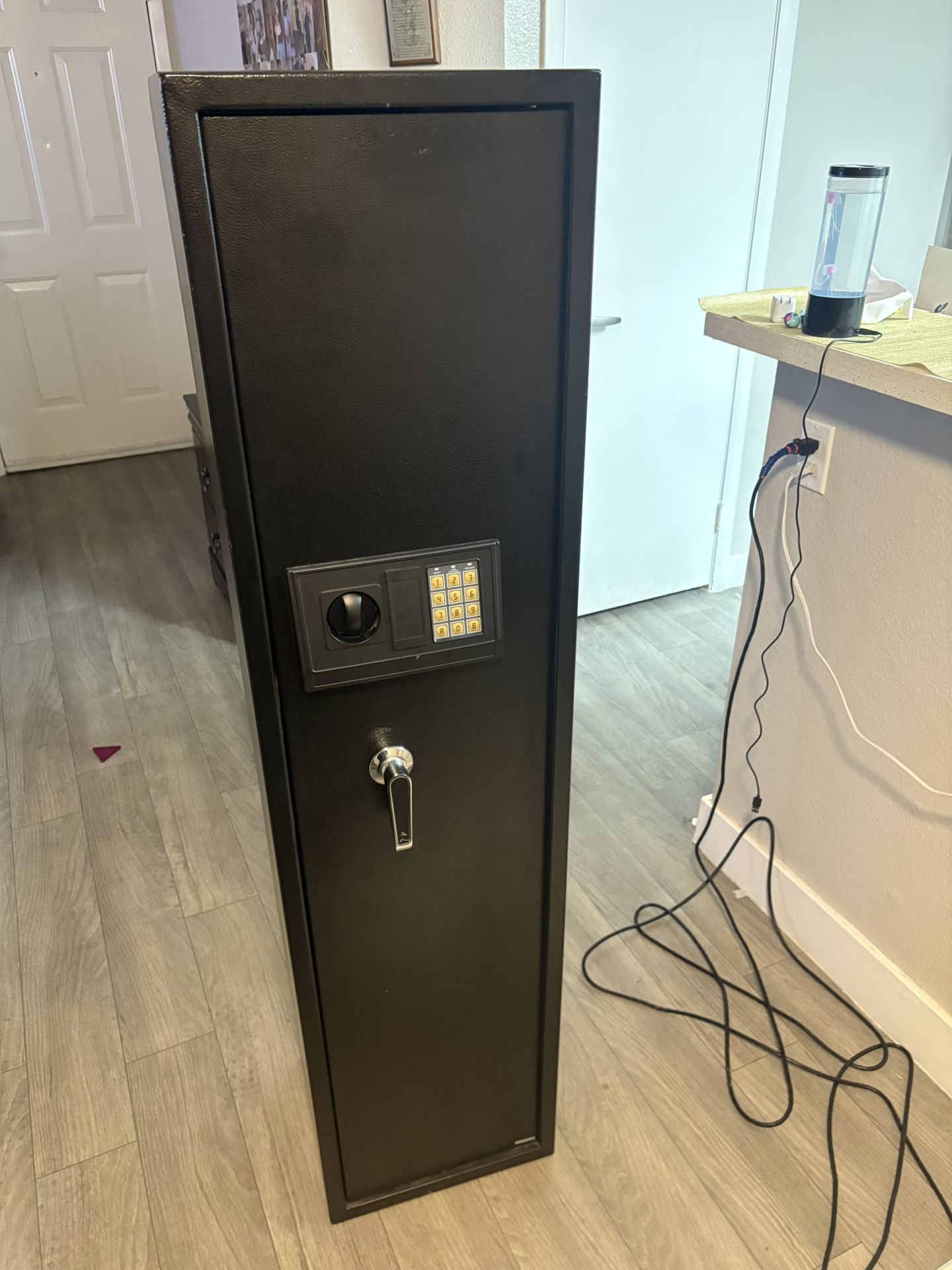 5’ gun safe that fits 5 rifles/shotguns. It also has a top storage box for ammo or smaller arms. Code safe plus the keys. Thick metal to keep your items safe. Has mounting slots in the back. 120 OBO