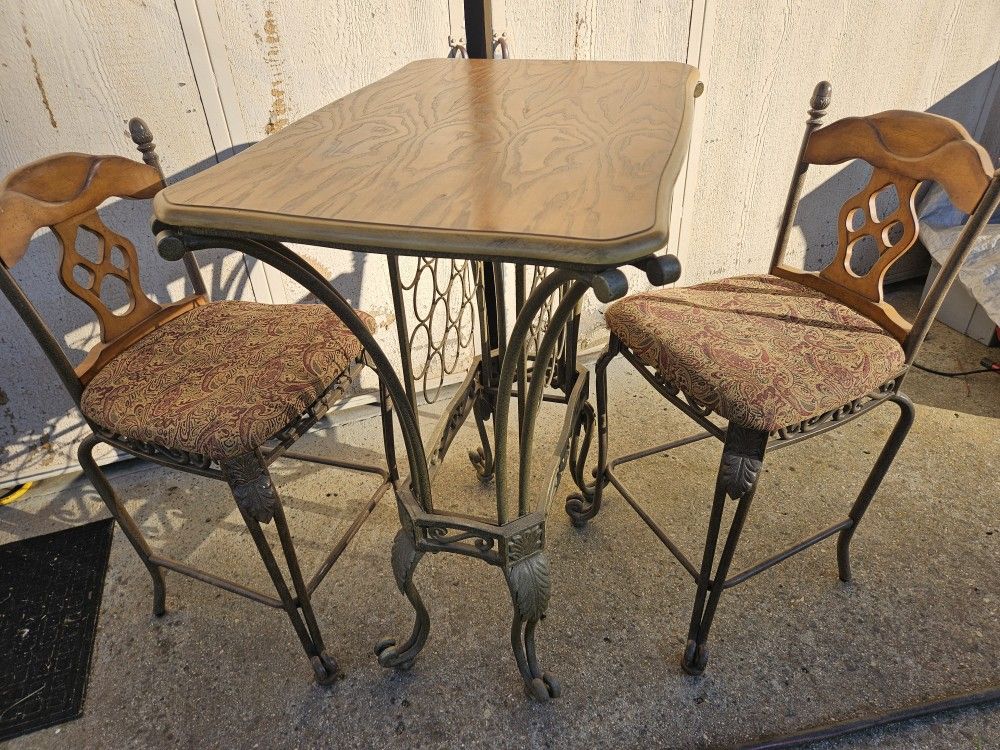 Bar table and stools Wine rack underneath Table is 43" tall Top is 36" X 24" Stool is 27" to seat. $60