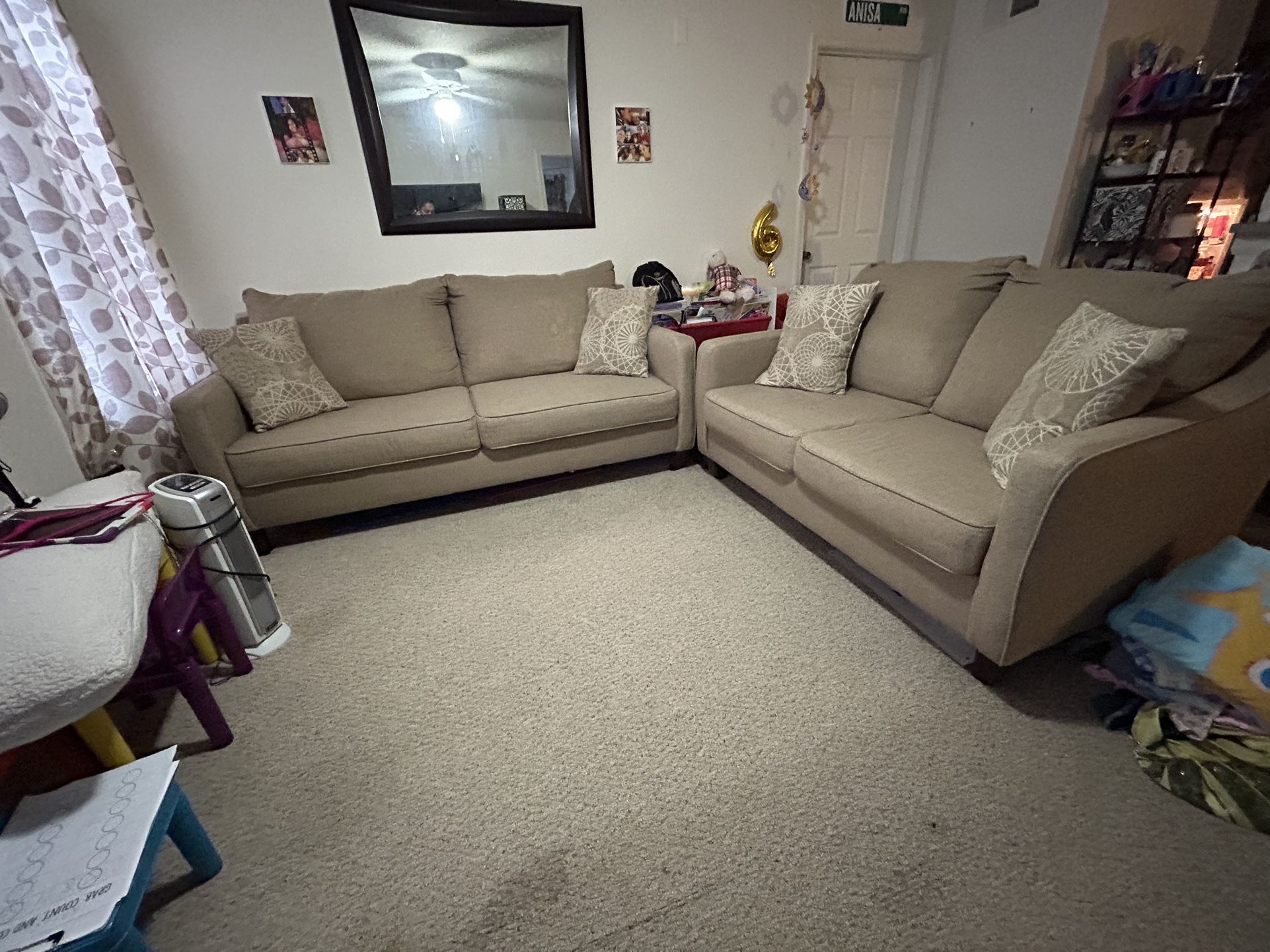 Beige couch set with 4 pillows. Loveseat 2 cushion couch Very sturdy No damages Serious inquires only. Pick up only. Located off Dean rd (east side of Orlando). I’m on a second floor.
