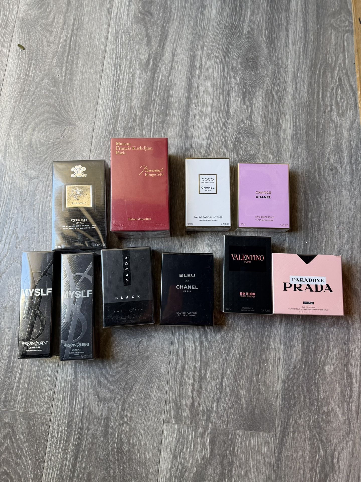 Have these different Colognes & Perfumes for men & women. - MYSLF YSL for men - Paradoxe PRADA - Coco MADEMOISELLE / Chanel Paris - Chance chanel eau de parfum - Baccarat Rouge 540 - Bleu De Chanel paris - Prada Luna Rossa Black - Valentino uomo born in roma coral fantasy - Creed Aventus