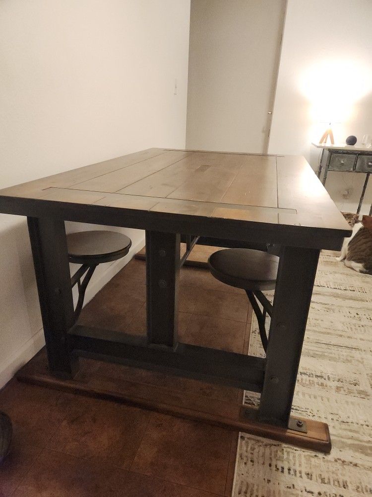 Sturdy table with seats that slide in and out. Good for space efficiency. Very sturdy and well made. Heavy.