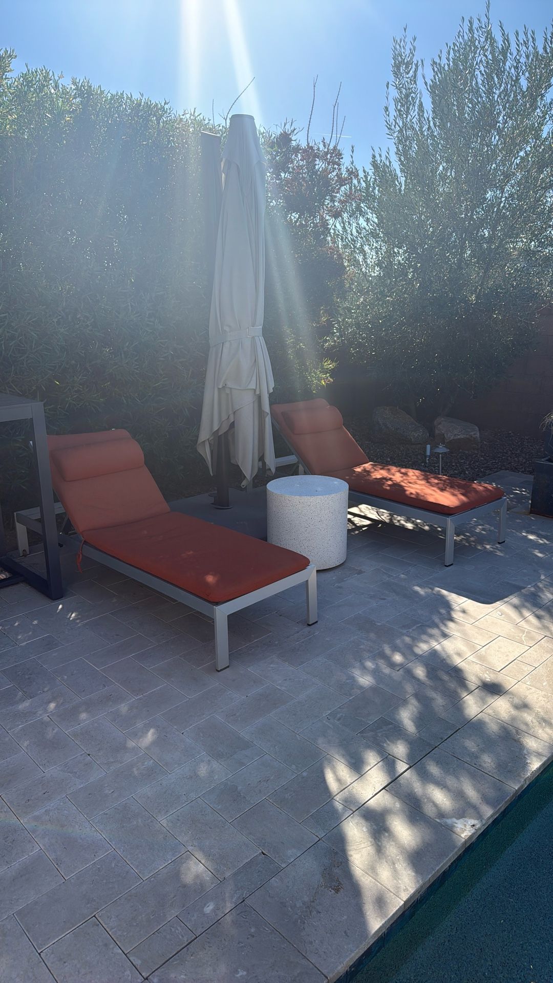 Two chaise lounge chairs with rust-colored sunbrella cushions. Mesh fabric underneath the cushions. Small wheels at the head allow for easy maneuverability. Head rest pillows are removable.