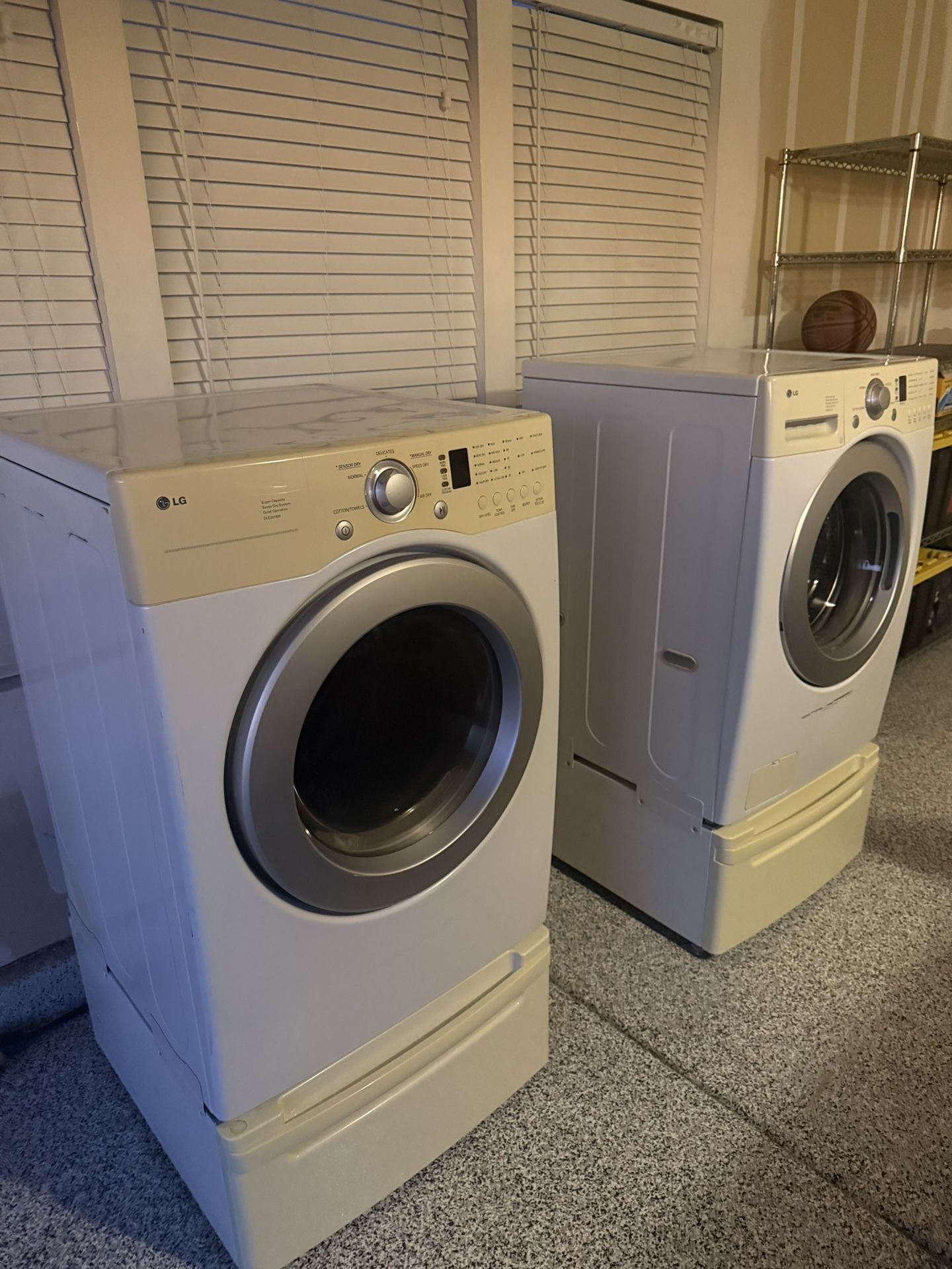 Selling an LG front load washer and dryer set with matching pedestals (drawers). • Washer (model WM2016CW- 3.6 cu. ft) works great, no issues (some scratches from moving, see pictures) • Dryer (model DLE2515W- 7 cu. ft) turns on and blows heat, but doesn’t dry clothes. I was told it could be a vent issue or thermal fuse (easy fix/low cost), but to be honest, I didn’t look into it and decided to get a new set when we moved • Both are electric • Includes storage pedestals Located in Casa Grande. Must bring help to load.