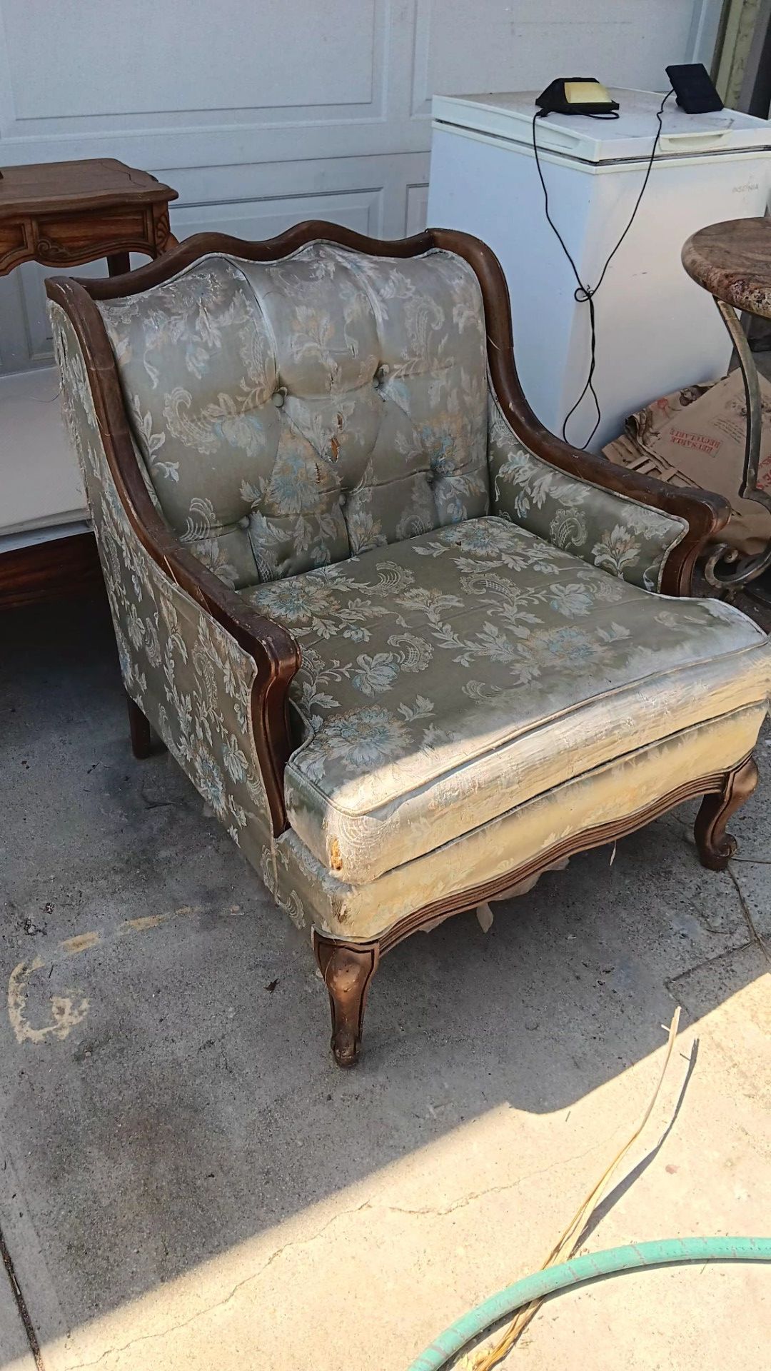This vintage armchair is styled in the French Louis XV provincial revival design, featuring a hardwood frame with carved cabriole legs and a tufted damask upholstered seat