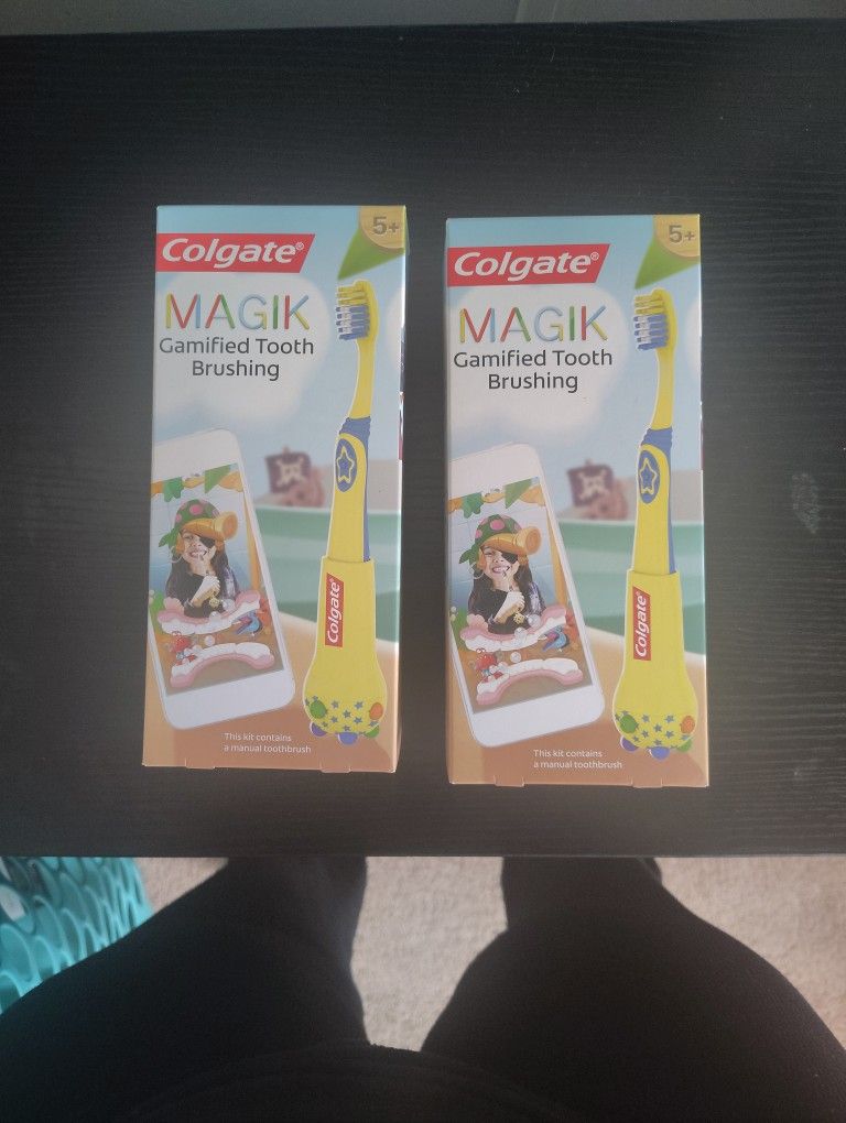 Make brushing time the best part of your child’s day! This isn't just a toothbrush; it's an Augmented Reality (AR) experience designed to teach kids aged 5+ how to brush properly while having fun. 🚀 Why Kids (and Parents) Love It: Gamified Brushing: Kids travel through virtual worlds and defeat "cavity monsters" using the free Colgate Magik App. Real-Time Tracking: The app uses the phone’s camera to track brushing technique and provides feedback to ensure no spots are missed. Rewards & Badges: Unlocks new games and masks as kids improve their habits. Parental Dashboard: Easily check progress and see how well your child is brushing from your own device. 📦 What’s Inside Each Box: 1x Colgate Kids Manual Toothbrush 1x Magik Connector (the smart base) 1x Phone Holder 💰 Pricing: $25 for one $40 for both (Save $10!) Condition: Brand New, Factory Sealed Boxes. Perfect for gifts or for siblings to start their dental health journey together!