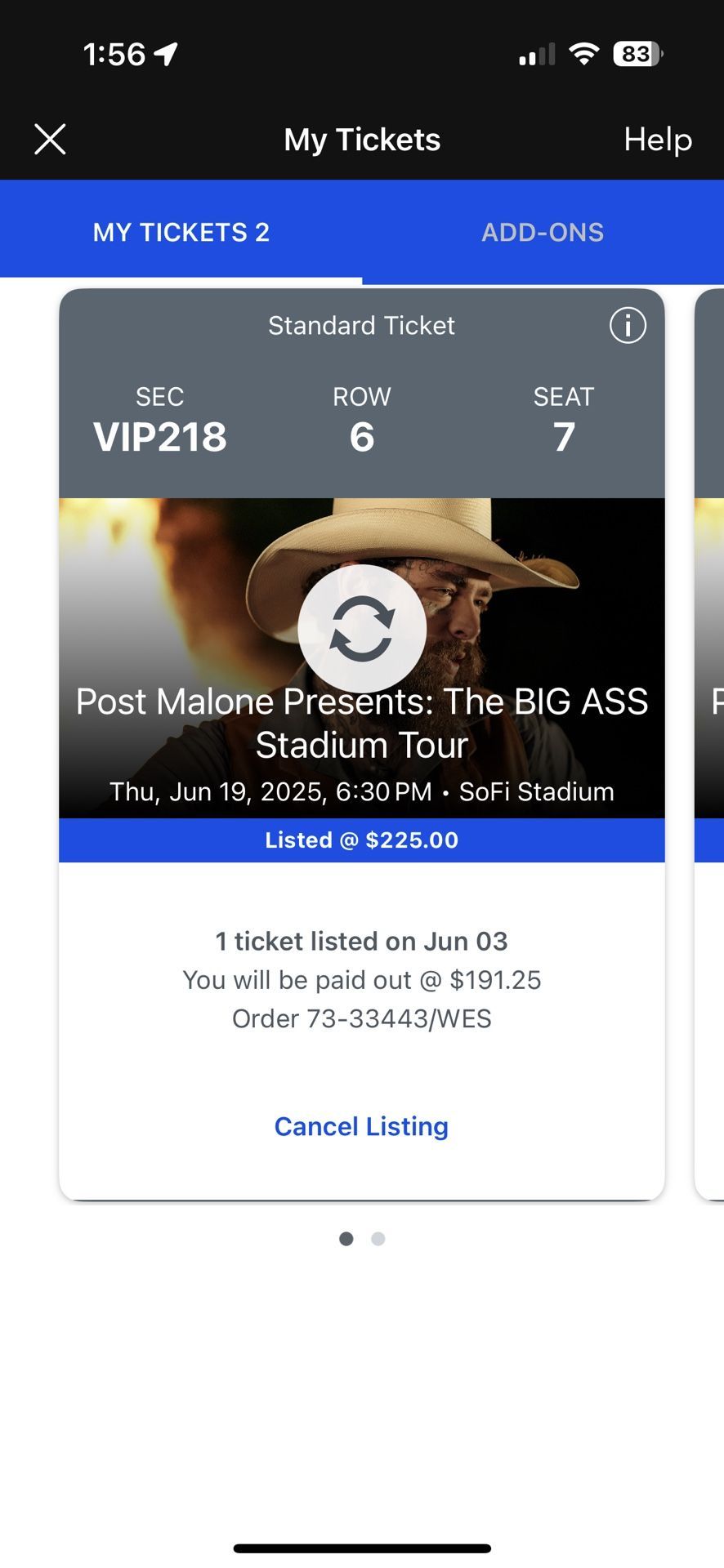 2 tickets!! Section VIP218 Row 7 $200 each OBO