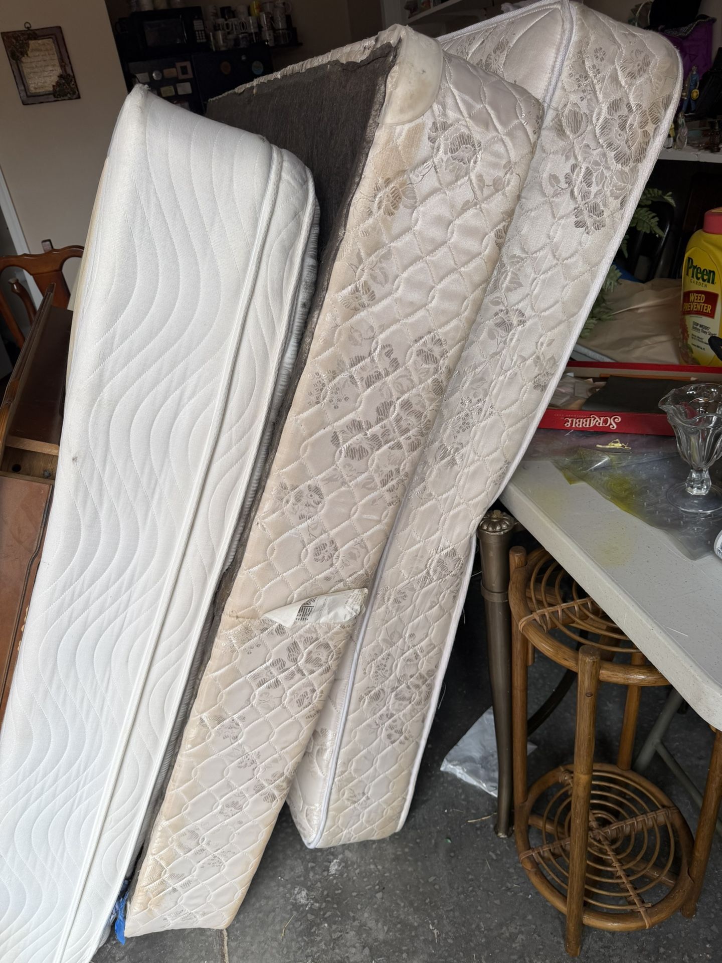 Comfortable Queen size mattress with box spring in good condition, 60.00 for the set. OBO I also have a single queen size mattress. 30,00. OBO Good condition Sold separately or make an offer for all 3 pieces. I’m also selling a wood table with 4 matching chairs for the low price of $60.00 OBO in good condition extra leaf included. I’ll post it separately .