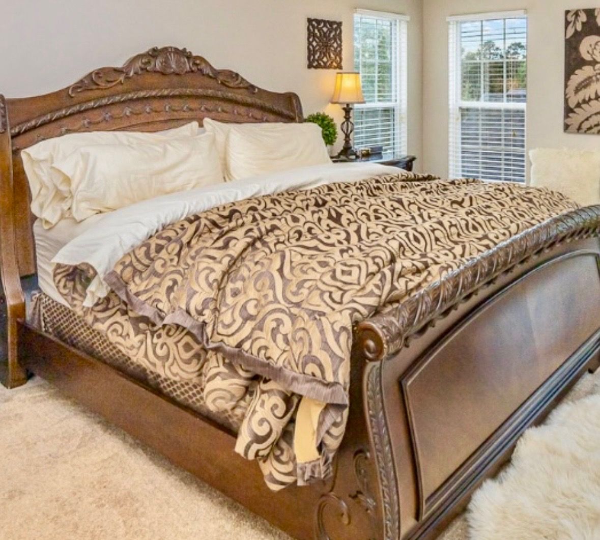 King size bed with dresser and two nightstands. Original purchase from Ashley’s furniture