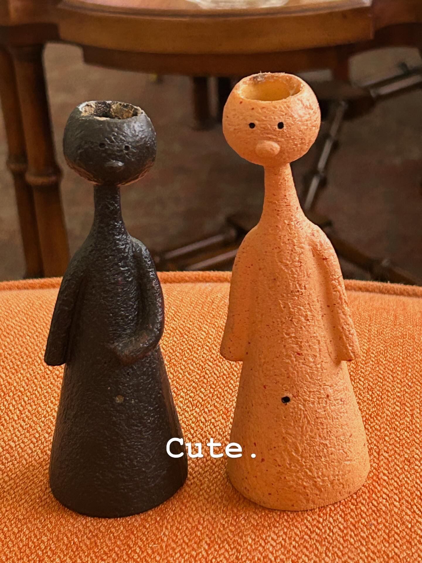 Put the “you” in unique; Pair of Modernist Speckled Resin Figural Candleholders/Air Plant Holders: You don’t have to try to be different; you just are. You always have been. And it’s okay. These rather modernist looking candleholders look very 1960s even though I know they are probably more like early 2000s. They are made of textured resin and they just have the “look.” They do appear as though they were used as an air plant container in a previous life but they could easily be used as candleholders. Both measures approximately 5.25” with one being slightly smaller. The hole in their head will fit a standard sized tapered candle. The price is $25 for the pair. They tend to sell for $25 for one. If you “saw” them elsewhere for less, you might want to get those because these are still $25. If you’re just getting them for a gift; still $25. If you really don’t like them but feel compelled to buy them; still $25. Whatever your reasoning is; they’re $25. No holds without that pesky partial, non refundable deposit. No shipping or deliveries. No trades, exchanges, or returns. No getting here and then telling me you only brought $20 because why? Because they’re $25.