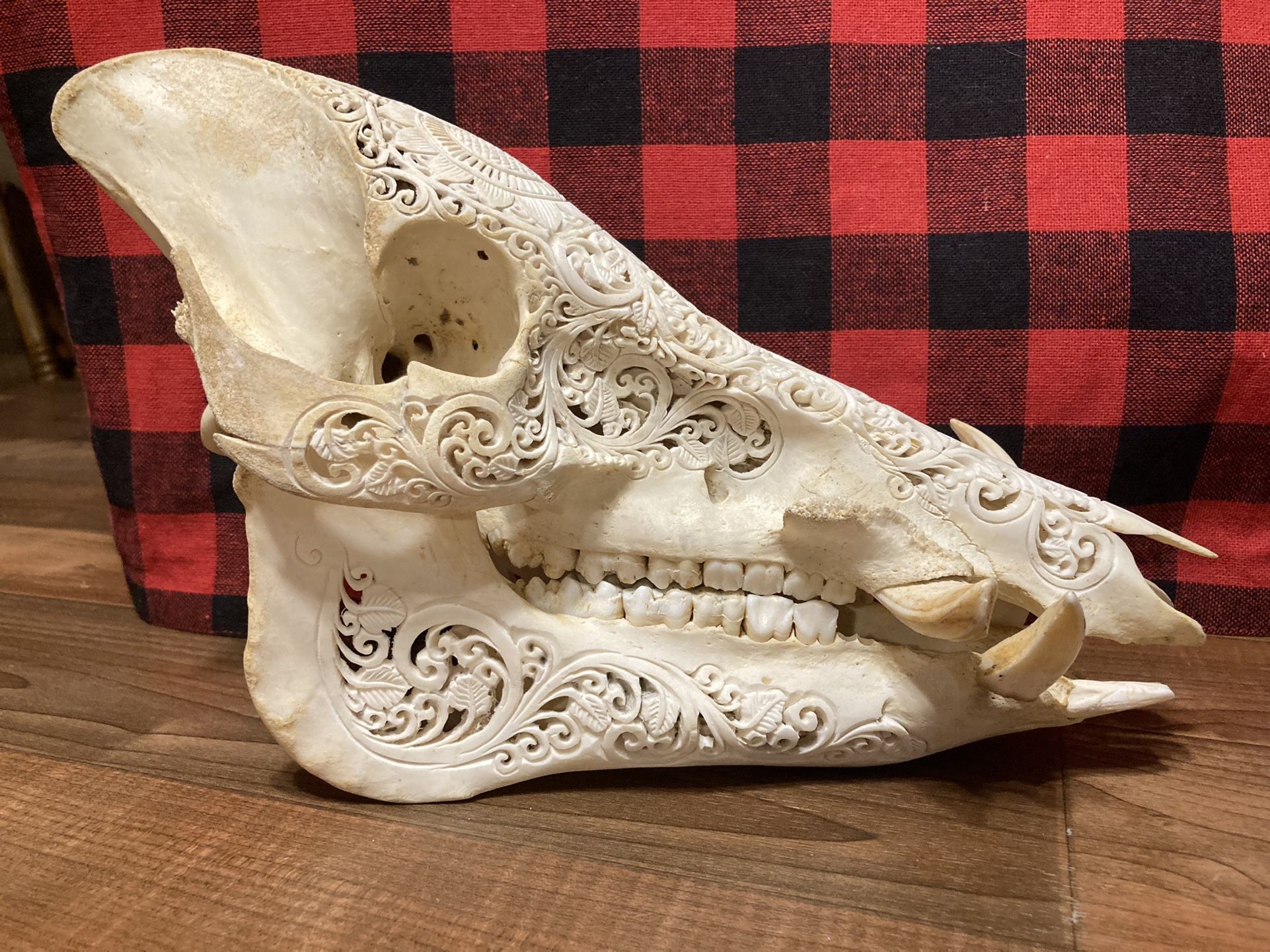 Beautifully detailed Balinese carved boar skull. This would make an amazing gift and impressive addition to any collection.