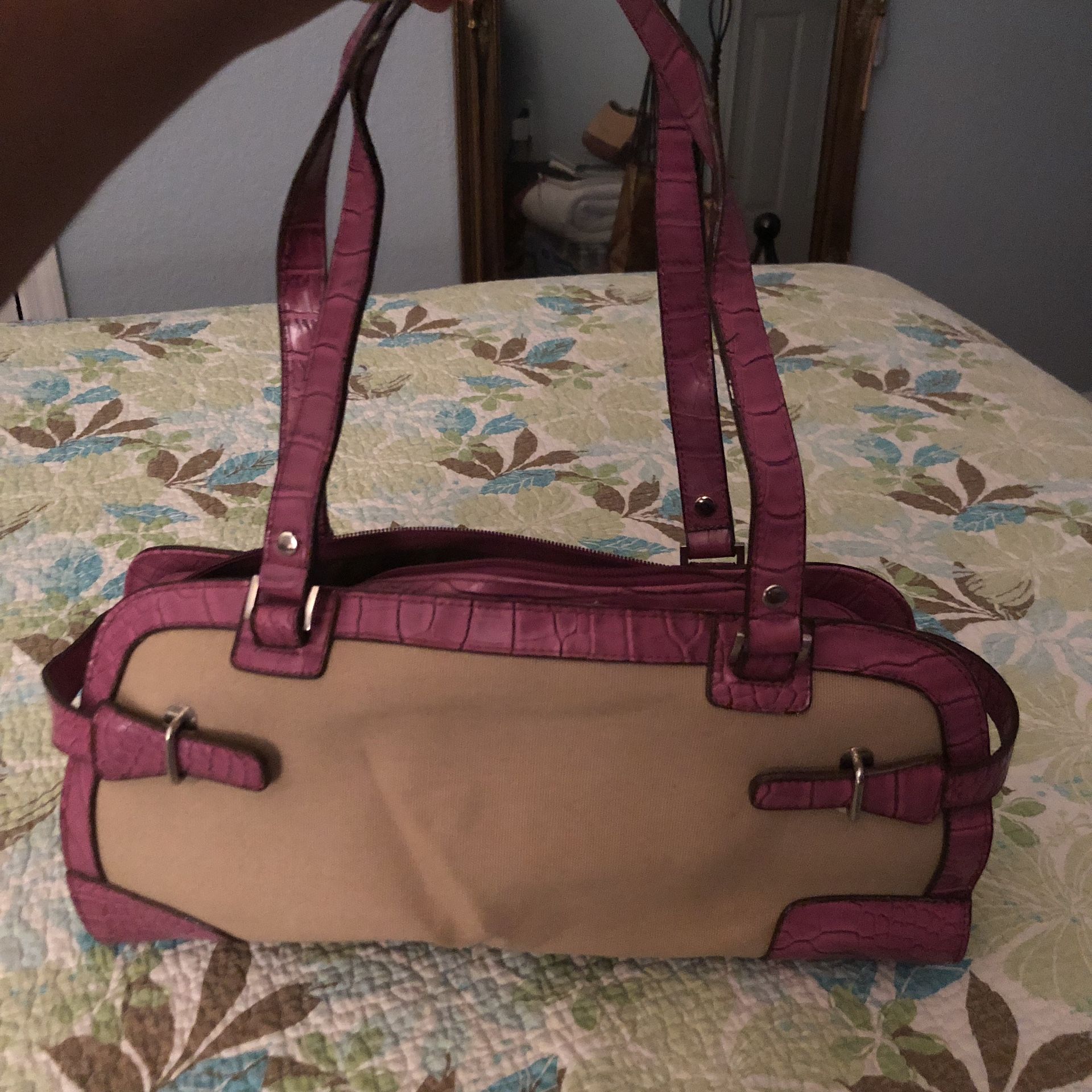 Natural Canvas & Fuchsia Vegan Leather Trim Purse NWOT Features Brass trim 1 interior zip pocket 2 interior slide pockets Nylon lining Zipper closure 15.25”l X 4.75”d X 6”h New Without Tags (NWOT) $20 $7 shipping $27.00 ( if we meet up for cash payment then subtract $7) * Will do group discount for purchase of more than one of my items * The larger the purchase the bigger the discount 2 items 5% discount on purchase 3 items 10% discount on purchase 4 items 15% discount on purchase 5 or more items 20% discount on purchase ** If you want to buy more than 1 item let me know I put together a bundle with the appropriate discount and a better shipping rate than the individual rates