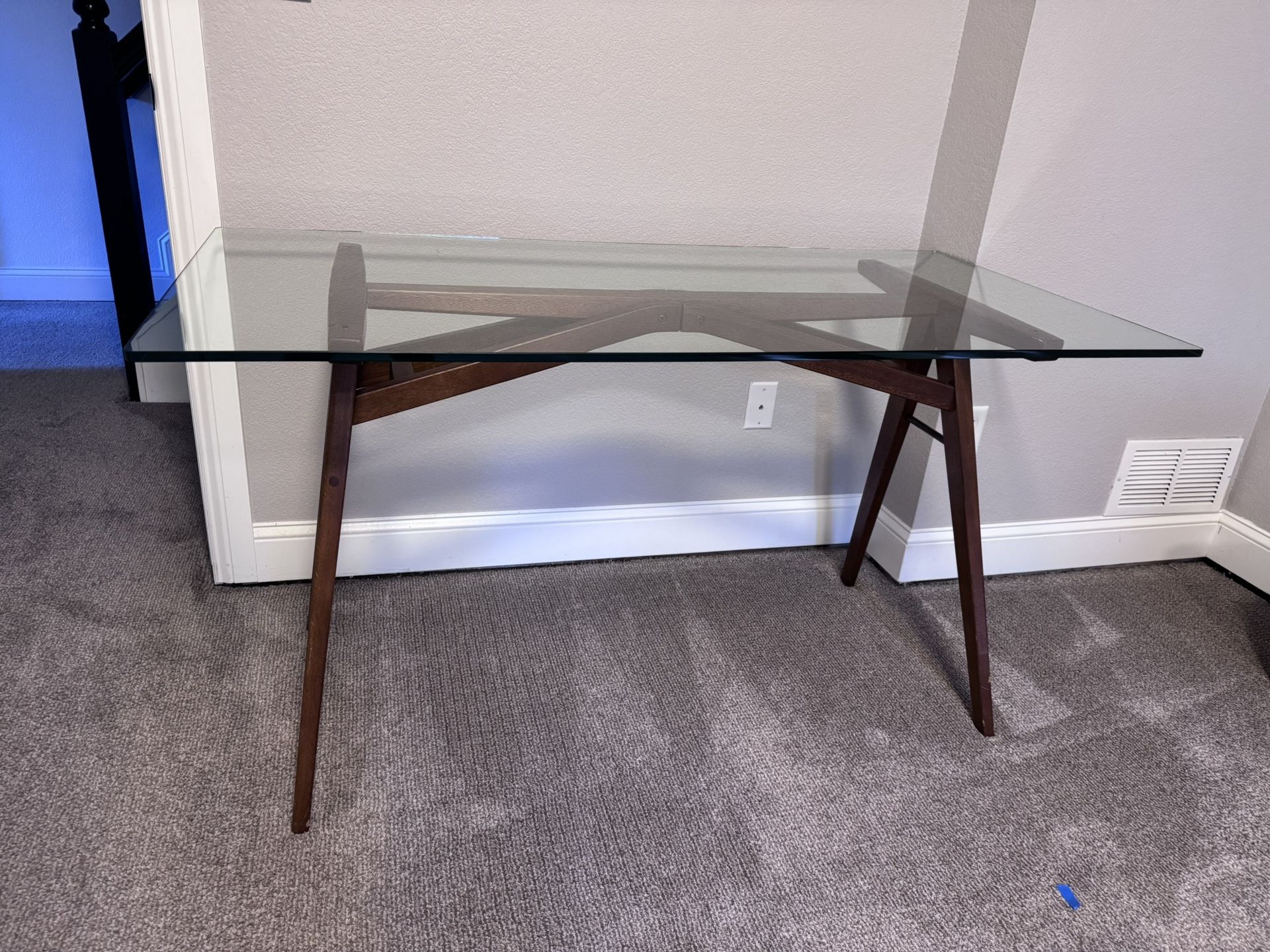 Beautiful West Elm Jensen Desk with a tempered glass top and solid wood base. Classic mid-century modern design—light, elegant, and sturdy. Perfect as a home office desk, writing desk, or console table. Originally purchased from West Elm and no longer available in stores. Details: • Genuine West Elm piece • Tempered glass top (no chips or cracks) • Solid wood base with A-frame design • Very good condition • Clean, smoke-free home $699 (West Elm) Approx. Size: 56” W x 28” D x 30”H https://offerup.com/redirect/?o=aHR0cHM6Ly93d3cud2VzdGVsbS5jb20vcHJvZHVjdHMvamVuc2VuLWRlc2staDE2OTQ=