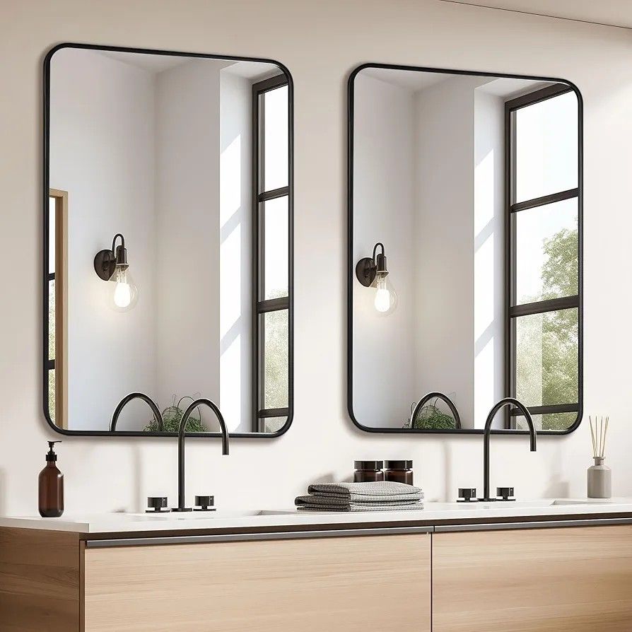 2 Pcs 24 x 36 Inch Black Metal Framed Bathroom Mirror for Wall, Rounded Rectangle Mirror Matte Black Bathroom Vanity Mirror,Anti-Rust, Hangs Horizontally or Vertically (2, Black, 24"×36") Brand new On Sale !! Very Good quality!! ***PRICE IS FIRM*** ***First Come First Serve*** *Check Size Details* Click on my profile listing to check more items. Our warehouse is located near Katy Legacy Stadium If you would like to come pick up DM me or call for address MIRROR SIZE:Our bathroom vanity mirror measures 24*36 inches. 2 pieces in total Modern Metal Frame:The black metal frame mirror adopts a round corner design, with an elegant appearance and smooth hand feel. Lightweight, corrosion-resistant, and wear-resistant Clear Reflection & NO Distortion:BOOLUU Rectangular wall mirror is made of HD 3.2mm tempered glass, Bright and deformation resistant, providing excellent reflection effect Easy Installation:This sturdy wall vanity mirror designed with 4 hook on the back for hanging horizontally or vertically. Very easy to install Wide Application:Our modern decorative mirrors are not only suitable for home Settings such as bathrooms, bedrooms, living rooms, fireplaces, over sinks, etc., but also for public places like hotels, restaurants, foyers, etc.