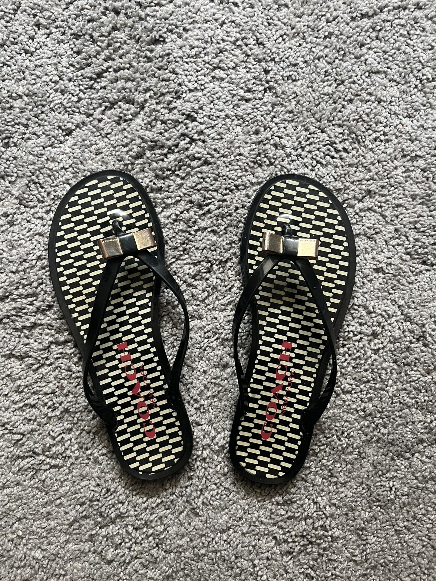 Authentic Coach women’s flip flops in a classic black and white design with logo print and metal Coach detail on the straps. These are gently used and still in great condition. ✔️ Comfortable and lightweight ✔️ Perfect for summer, beach, pool, or everyday wear ✔️ Clean, well taken care of ✔️ Smoke-free home Retail was much higher — priced to sell fast 💨 Message me if interested! First come, first served.