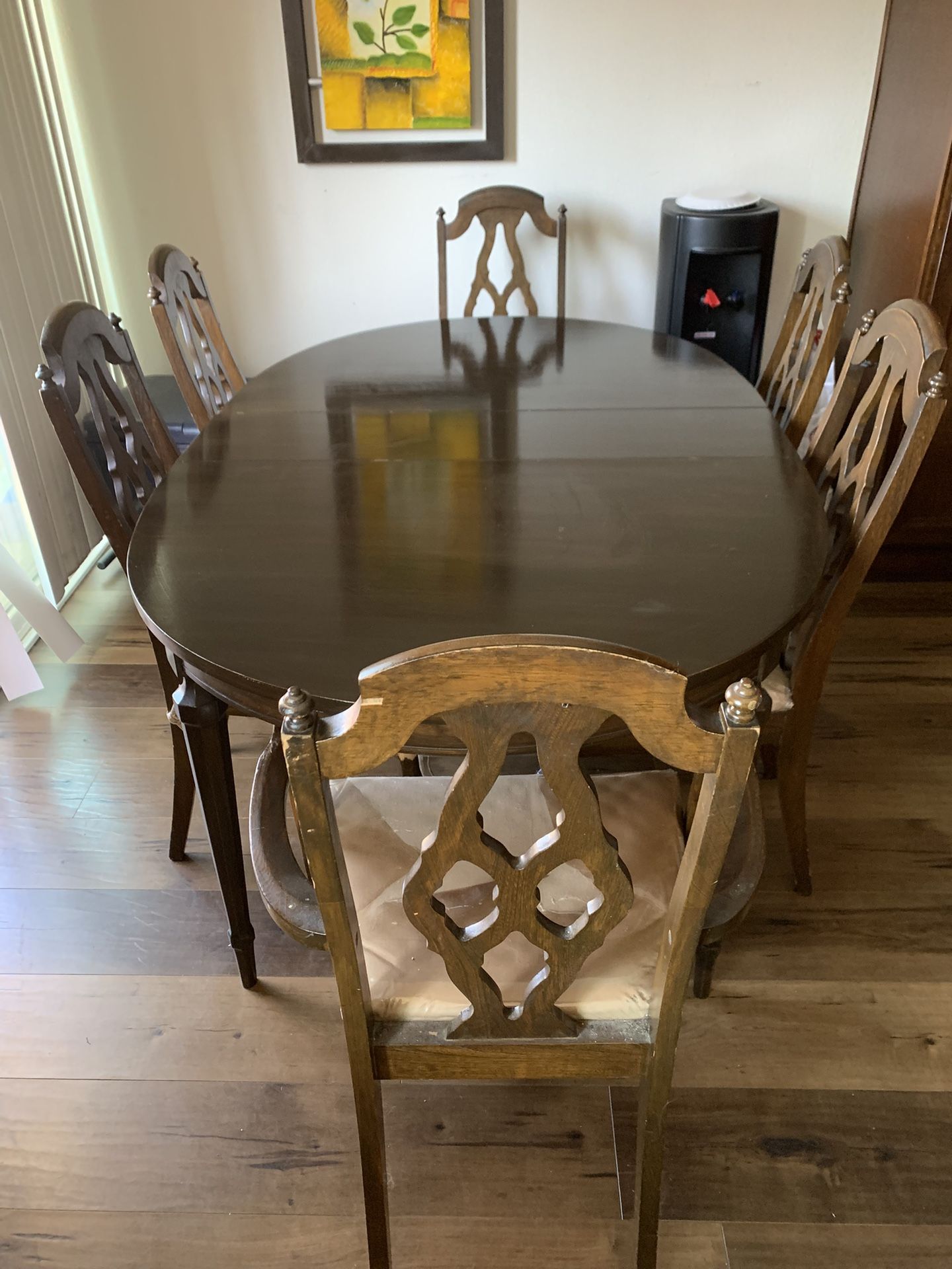 I have for sale a solid wood dining table with 6 chairs $200, 3 living room tables $130 and a dresser draw with a mirror. $200. The pictures and other items are included.