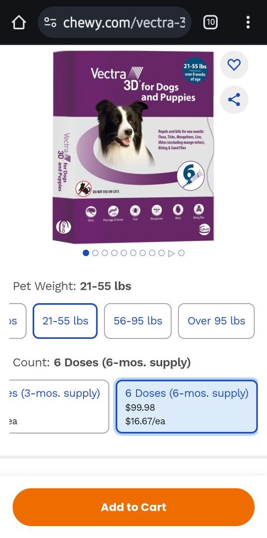 New but opened package. Vectra 3D Flea treatment. Came as part of a 12 pk. I am keeping the other 6pk. Retail at Chewy is $99 /6pk.