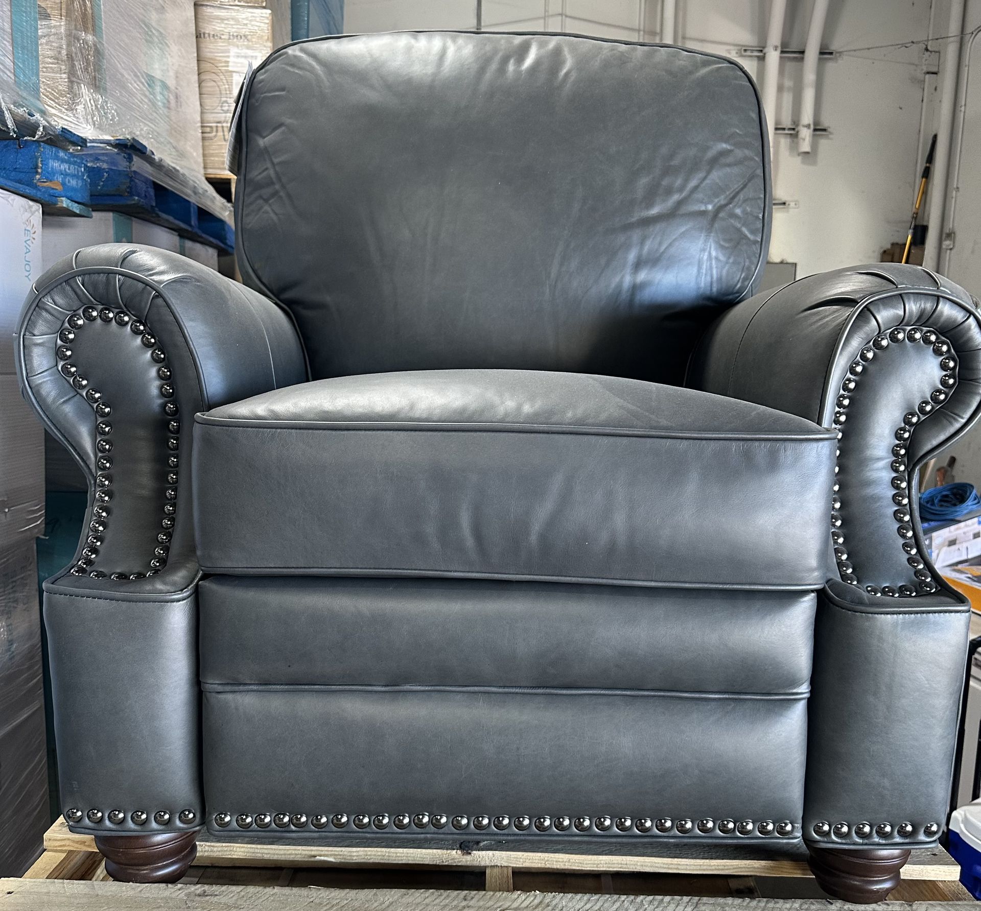 New never used classic-style leather chair featuring rolled arms with nailhead trim push-thru-the-arms reclining Retail price: $1200 Pick up locally