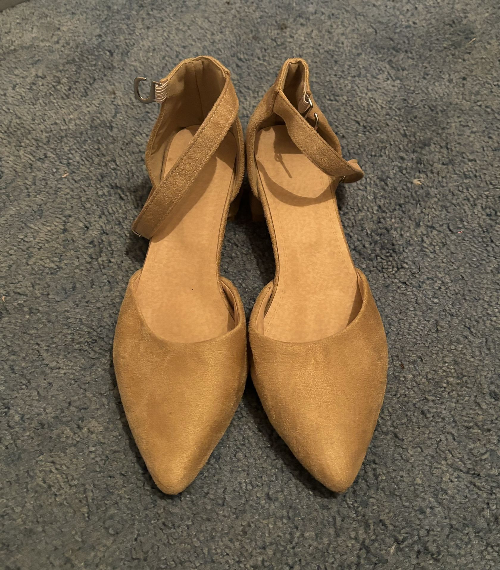 Beige suede material pointy toe shoes with 1.75” chunk heel. Strap at ankle. Never been worn.