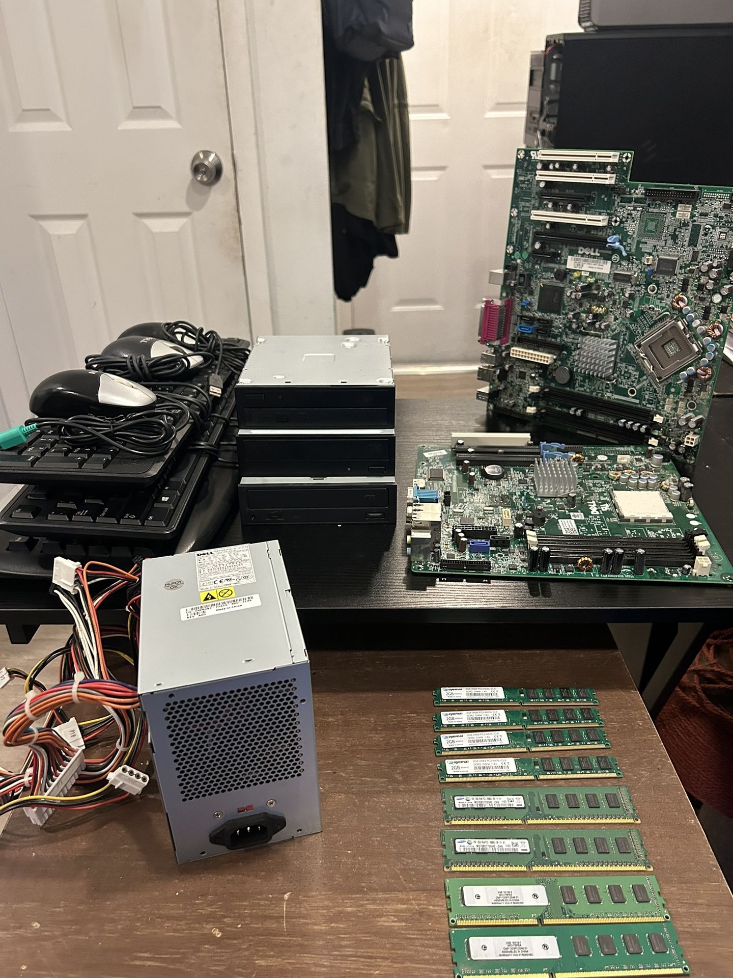 3 Dell optical drives 3 Dell keyboards 3 Computer mouse 2 Dell mother boards 1 Dell power Supply 8 assorted 2GB RAM sticks Best offer on all of it if you want