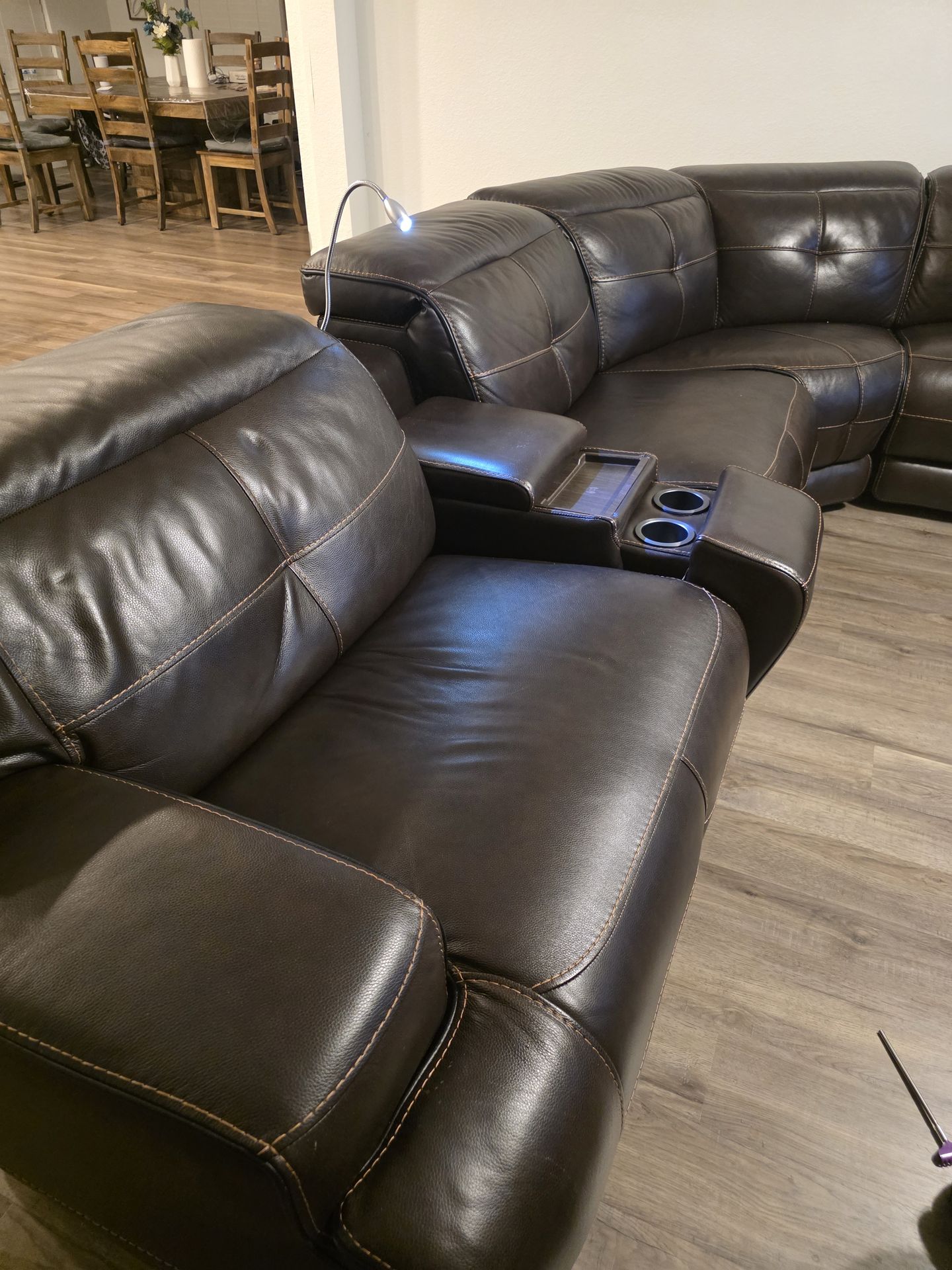 The couch is in really good condition the only feature that doesn't really work is the wireless charging platform. Features: 2 reading lamps 4 usb ports 3 Reclining seats 4 cup holders 2 storage areas Espresso brown. MUST: Have a truck and pick up. Have 2 people to help load Price is set. Non negotiable.