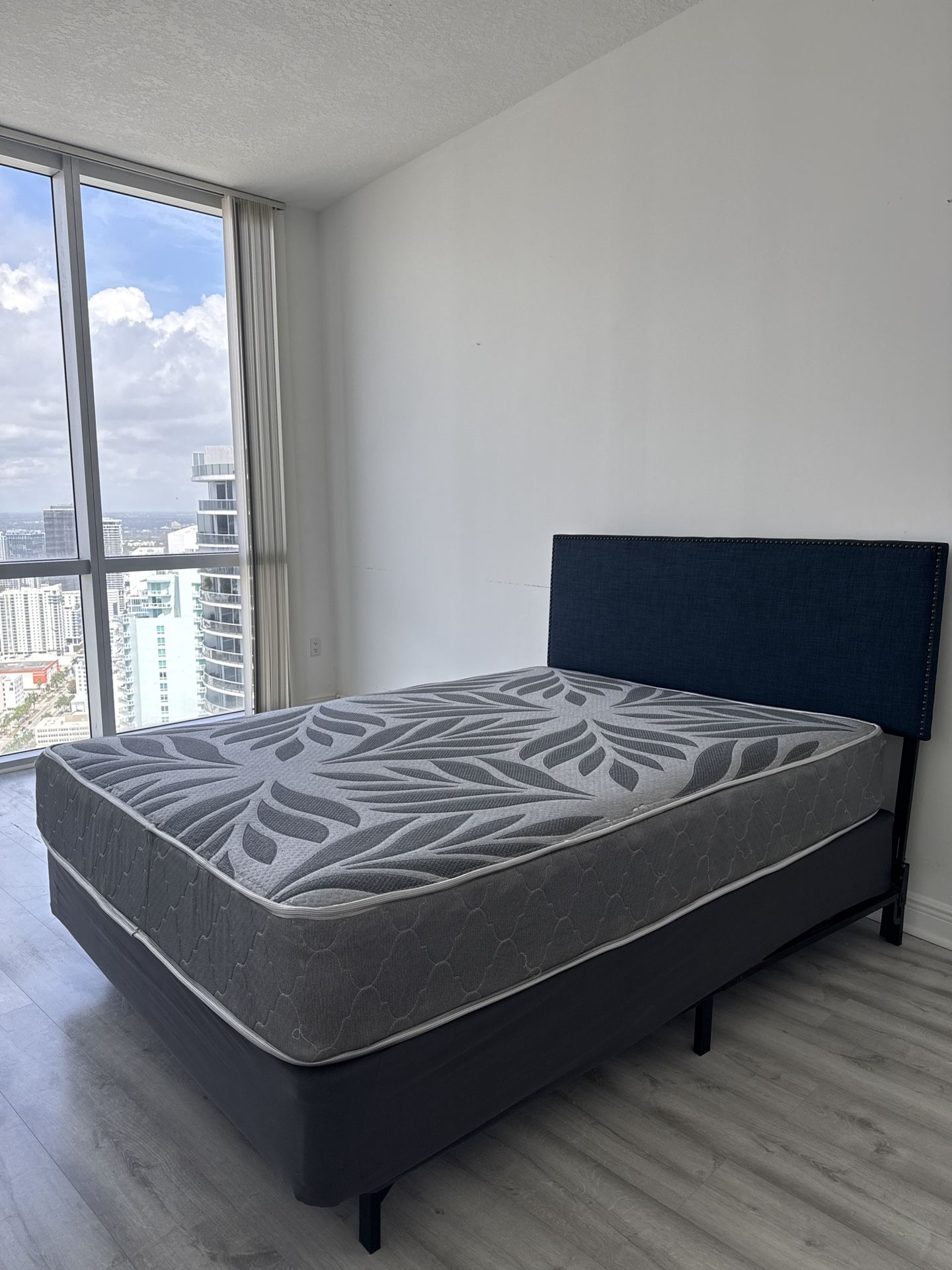 Price: $100 Description: Queen-size bed with mattress in good condition. Clean, comfortable, and ready to use. Includes sturdy platform frame and upholstered headboard — no box spring needed. Perfect for a guest room, apartment, or quick move-in. ✔️ Queen size (60” W x 80” L) ✔️ Mattress + platform frame + headboard included ✔️ Modern dark frame with blue upholstered headboard ✔️ Smoke-free home ✔️ Easy pickup Must be picked up by Monday. First come, first served. Pickup in Downtown/Midtown Miami area. Message if interested.
