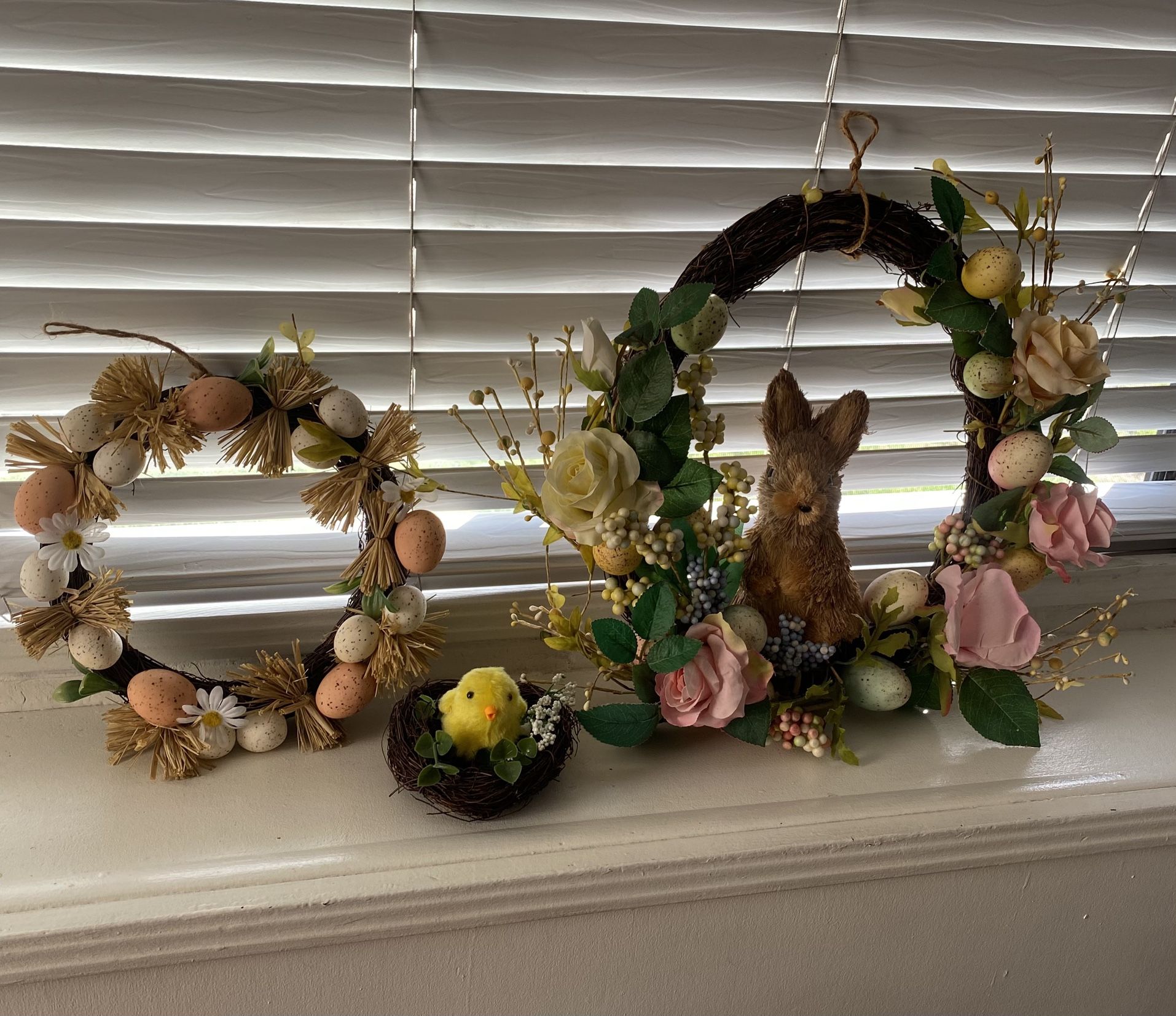 all decor is in very good shape it’s 2 wreaths 1 Large and 1 medium and a baby chick on its nest .. all 3 for $ 15.00… you’re welcome to come and check them out.