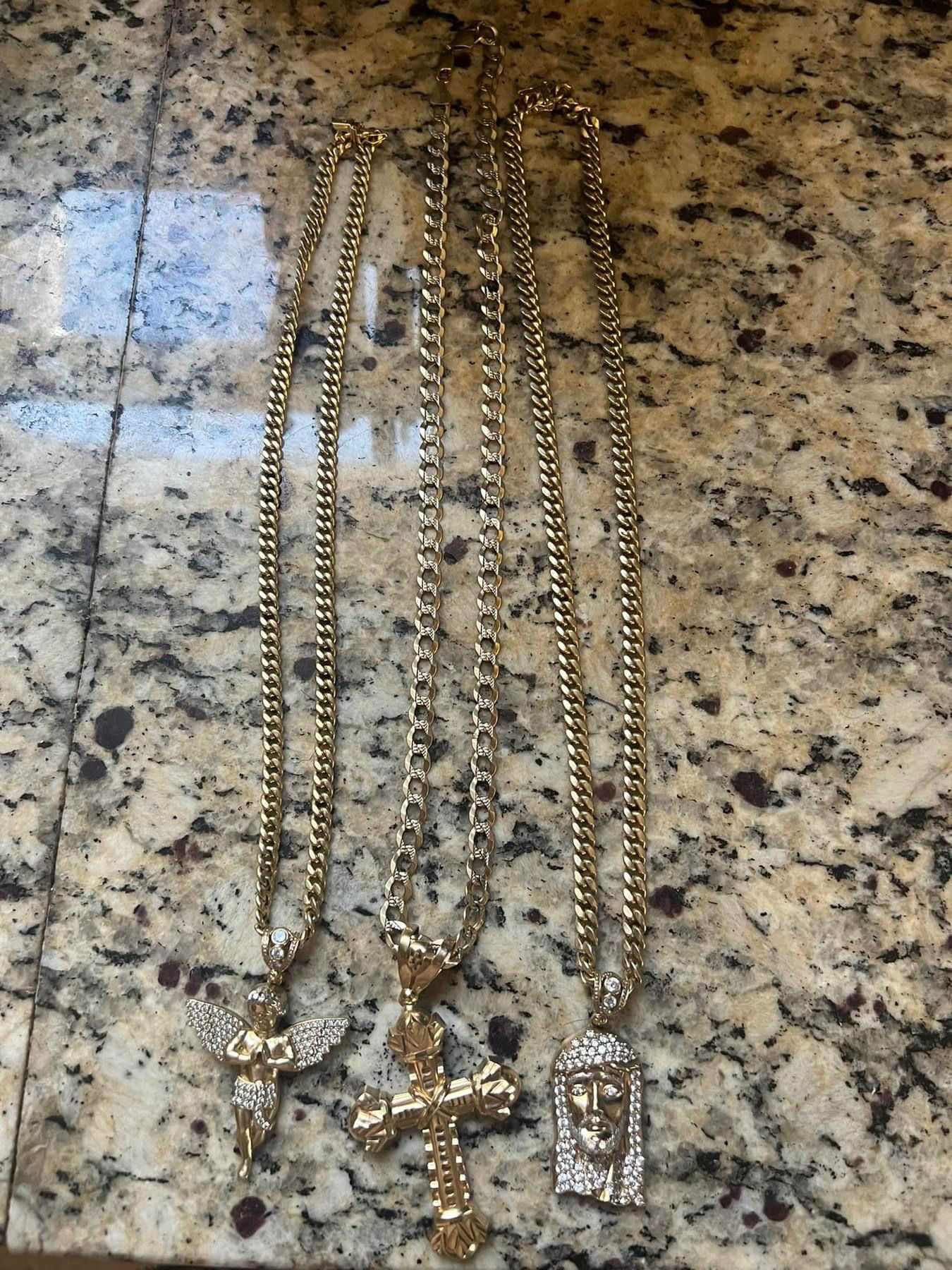 Local only Medallions 10k $500 each jesus piece 10.72g Baby angel 9.46g cross 11.34g 22” small crub cuban 10k $900 19.31g 26” The flat cuban 10k $1500 33.22g 24” the wider curb cuban 14k $2000 30.90g braclet 10k $850 25.93g Versace ring 14k $450 5.73g cross ring10k $350 4.31g Ring black onyx 10k 6.52 $350 WILL NOT ANSWER TO IS IT STILL AVAILABLE FIRM. non-negotiable prices. I don’t need to sell them. They will collect dust before I go lower. I will put weight up later. Cash only and meet at any jewelry store you want.