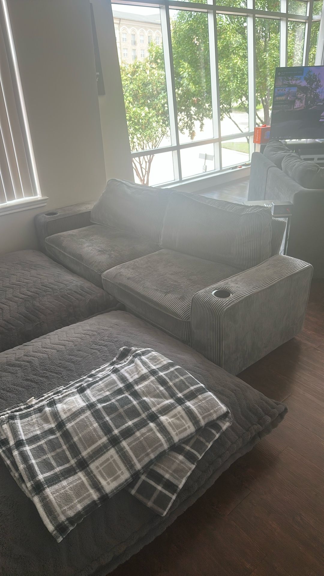 Barely used , had it for my gaming set up but redoing my set up , have usb ports on the right , 2 cup holders , easy to move can sit 3 average adults comfy 4 if your slimmer , must be picked up