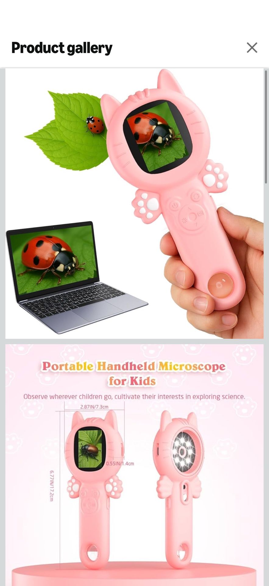 I have 4. $10 each 2 blue 2 pink Light Source Type LED Material Plastic Color Blue Dinosaur Product Dimensions 6.77"L x 0.55"W x 2.87"H Real Angle of View 120 Magnification Maximum 500 x Safe & Durable Portable Kids’ Microscope: This 2 Inch IPS kids' microscope is made of safe ABS material, and comes with a silicone protective case and a hanging rope, which is drop resistant and durable. it measures 6.77 * 2.87 * 0.55 inches and weighs 0.23 pounds, which can be held by hand, hung around the neck, or carried in a pocket, making it suitable for the child to use 2-in-1 Children's Microscope Camera: The microscope lens has a magnification of 500x and a zoom function of 16x, which can automatically focus and support multi angle observation of objects. You can take detailed pictures of objects in microscope mode. The 8 LED auxiliary light sources around it can make the field of view clearer and brighter. The camera lens can capture 2-megapixel photos and 1080P videos (Inserting a storage card can store enough content ) Children's Scientific Exploration Toys: observe the microscopic structures of flowers and leaves in the courtyard, various insects in the mountains and forests, sand crabs and seashells on the beach, human skin or clothing fabrics, etc. Kids aged 3-5 can use microscopes to visualize the microscopic world and stimulate their interest in exploring nature and science. Kids aged 5-10 can also use camera lenses to record interesting scenes during observation, making it easier to recall and share Built-in Rechargeable Battery & PC Connectivity: The kids' microscope comes with a built-in rechargeable battery that can last for 1.5 hours, making it perfect for indoor observation or outdoor exploration. The accompanying USB cable can be used not only for charging but also for connecting a microscope and a PC to obtain a wider field of view. Compatible with Windows Vista/XP/7/8/10/11, MacOS x 11.0 or higher Ideal STEM Gift for Kids 3-10: Great toys for girls and boys, this digital microscope inspires curiosity, scientific thinking, and hands-on learning. A great gift for birthdays, Christmas, or any special occasion—fun, educational, and full of discovery. Tip: there may be a lack of focus when the battery is low. Please charge the microscope in a timely manner