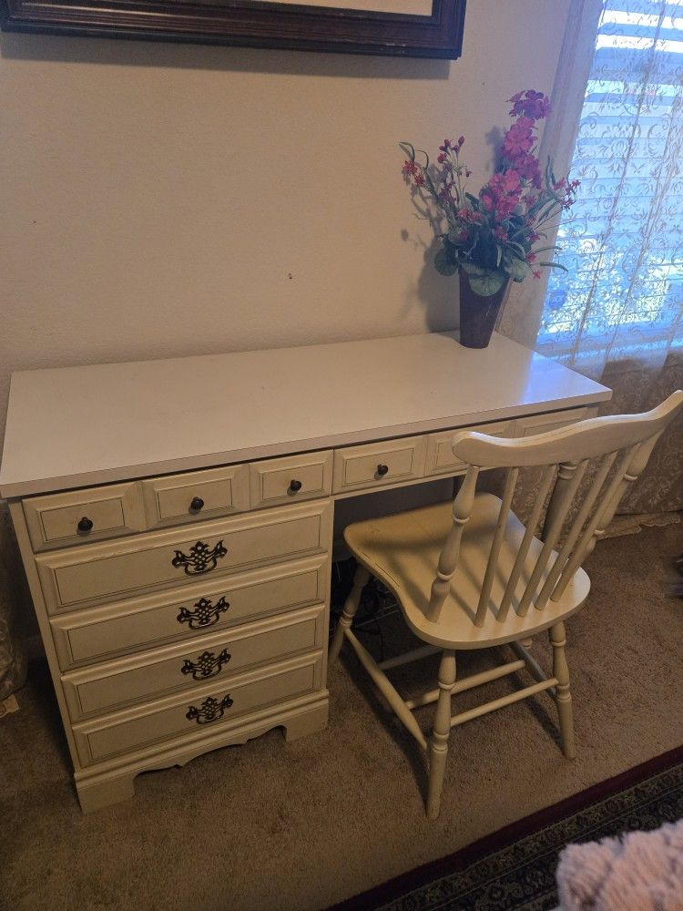 Beautiful piece of furniture set. I've had it for over 5yrs. The chair has a hair line down the center of the chair. ( shown on the pic) It doesn't effect the chair underneath, also shown on pic. Has four drawers, all in working condition. Two top drawers, and two deep drawers. Lots of storage and space. Great condition. Need gone, for other pieces of furniture to fill the space. Must pick up. Cash only please. OBO.