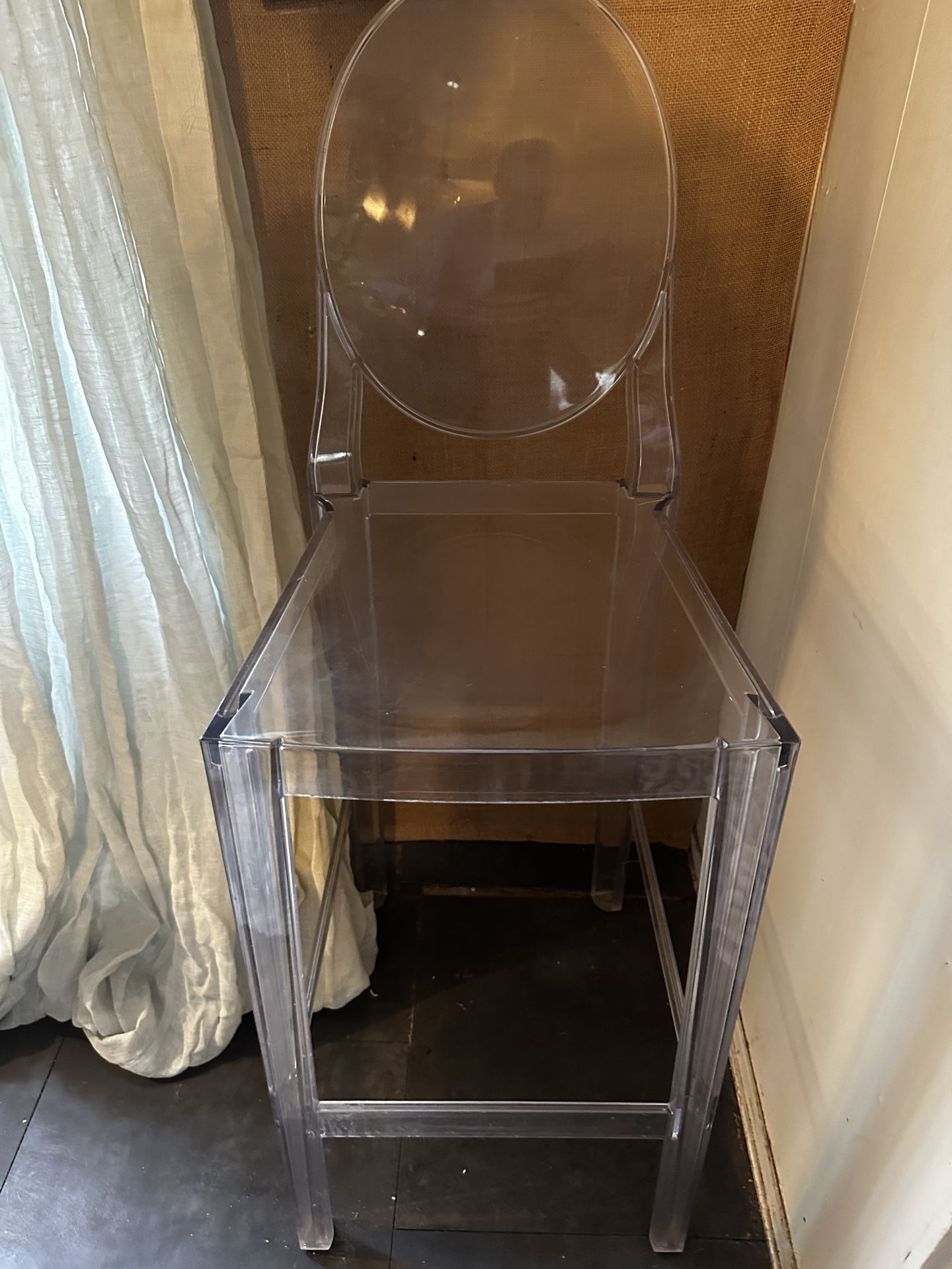 Kartell "One More" or "One More Please" bar or counter stools designed by Philippe Starck. They are made in Italy from transparent or batch-colored polycarbonate. The price for a new pair is approximately $1,100 but I am listening mine at $300 for the pair for a quick sale today because I am moving. Seat height is 29” from the ground.