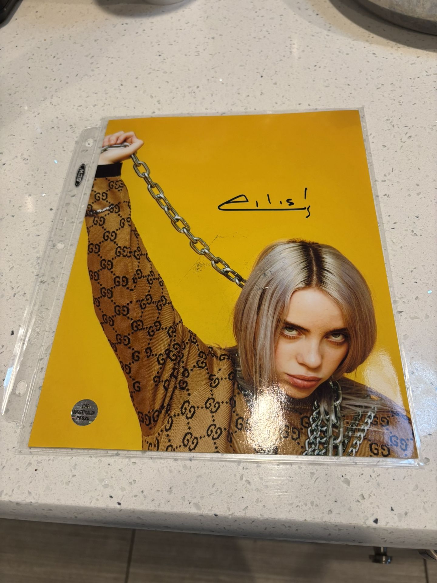 Selling an authenticated 8x10 Billie Eilish signed photo (Elite Authentication #25025, checkable online) with a cool Gucci design. Like-new except for minor damage above her head on the left (see pic 3, caused by a card). Still a great collectible for fans! Pickup only in South Scottsdale near McDowell & Hayden. Cash or Venmo preferred. First come, first served—grab it quick!