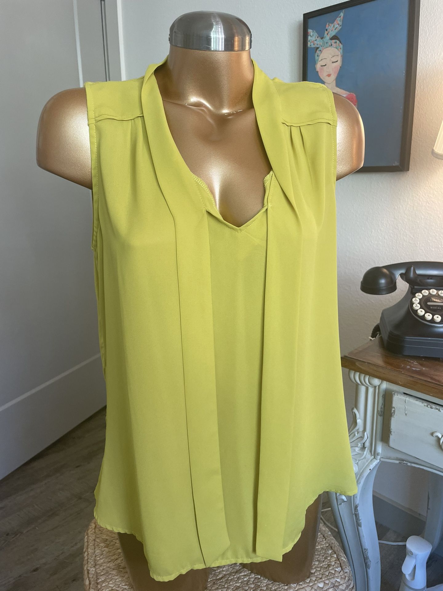 NY & Company sleeveless blouse in size L, in a beautiful vibrant green tone. Features an elegant layered front design with a flattering neckline and a soft, flowing fabric that drapes beautifully. Very polished yet easy to wear, perfect for work, dinner or dressing up a casual outfit. A chic, versatile piece that adds color and elegance to any wardrobe. Price: $7