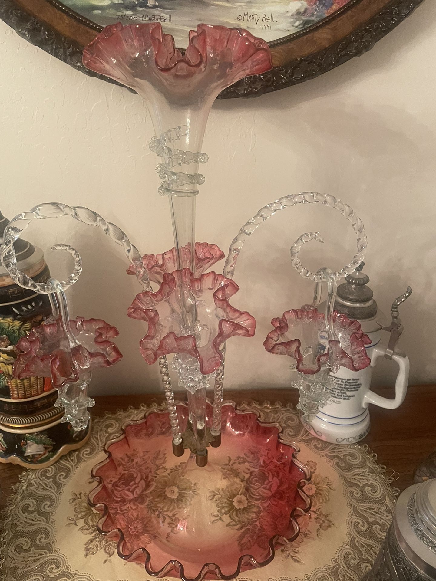 21” tall cranberry to clear glass Epergne. Center lily with four seated lilies surrounding, all with clear handled glass baskets and all with crimped cranberry edges. Ruffled with applied clear glass Rutgers to lilies. 10” diameter round conforming base plate cranberry with applied clear glass edges.