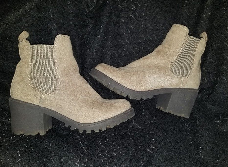 These are a women's "Rue21: Etc!" tan suede slip-on ankle boots with a block style heels. These boots are as seen in pictures in the listing, also they are only available in a women's size 8.